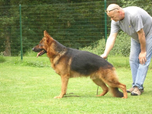 Bonnes allures, bonne prise de terrain, bon type, belle pigmentation.Manque de fermeté du dosClasse 6-9 mâle