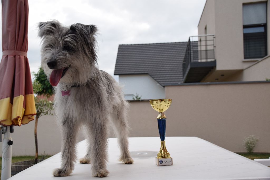 chienne dans le format; denture en ordre; EXC tête avec bonne ligne; formes harmonieuse dans ses proportions; oreilles un peu hautes mais bien portées; robe un peu délavée; B construction général; B ligne dessus; B angulations; B allures à l'arrière, manque un peu de fermeté à l'avant.
