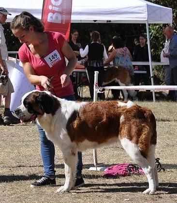 Tête très bien construite. Très bon oeil, forme, couleur, expression. Dentition correcte. Très bon poitrail, poitrine, ligne dessus. Ossature forte, arrière main un peu sur bâtie. Se déplace correctement. Très bon caractère et présentation.