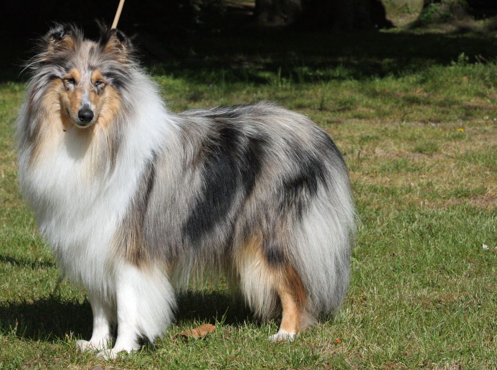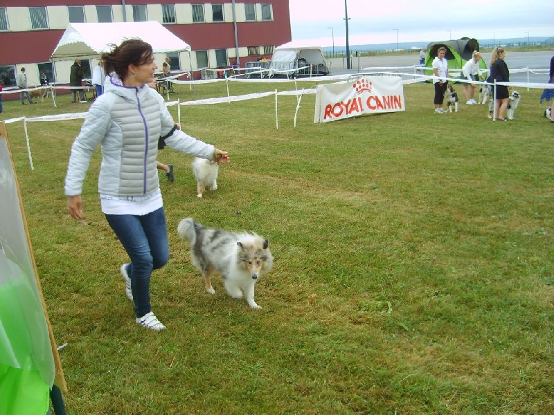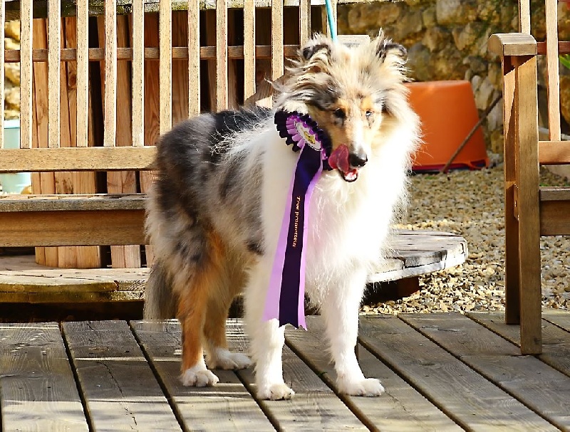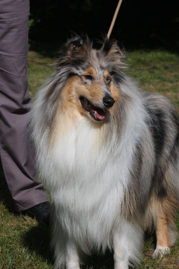 Exc Type, Exc Format, Ossature intermédiaire, jolie tête expressive, oreilles bien implantées mais pas assez retombantes, stop léger, ligne de dessus correcte, Excellent aplomb avant, un peu panarde de l'arrière, queue de longueur correcte, excellente texture de fourrure, j'aurais préféré un bleu plus lumineux, feux corrects, Chienne joyeuse, serre un peu à l'arrière aux allures, Allures dynamiques difficilement appréciables car ne pense qu'à jouer.