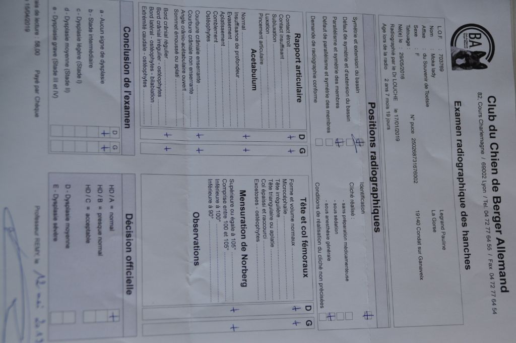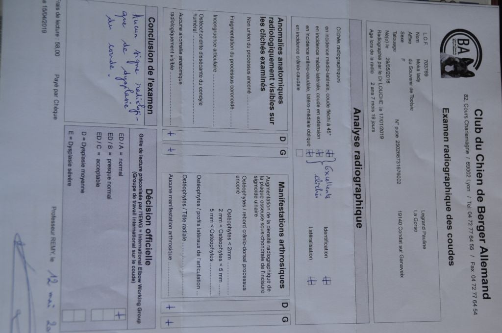 Myelopathie dégénérative type A - Indemne +/-Identifié ADN - ouihyperuricosurie - Exempt +/+Gène longueur du poil - porteuse gène poil longDysplasie hanche - A/ADysplasie du coude - A/Adentition - DCC