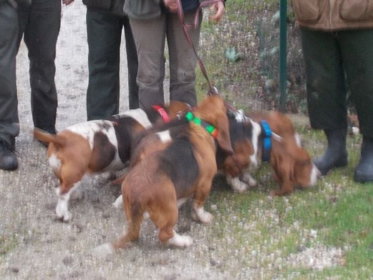 Lot n°9 - 4 Bassets Hound d'un bon modèle, en état de chasse appartenant à la meute des Côtes de la Saunade.Par temps pluvieux. Découplés sous une pluie battante les chiens quêtent mais n'auront pas l'occasion de s'exprimer jusqu'à la fin du parcours.