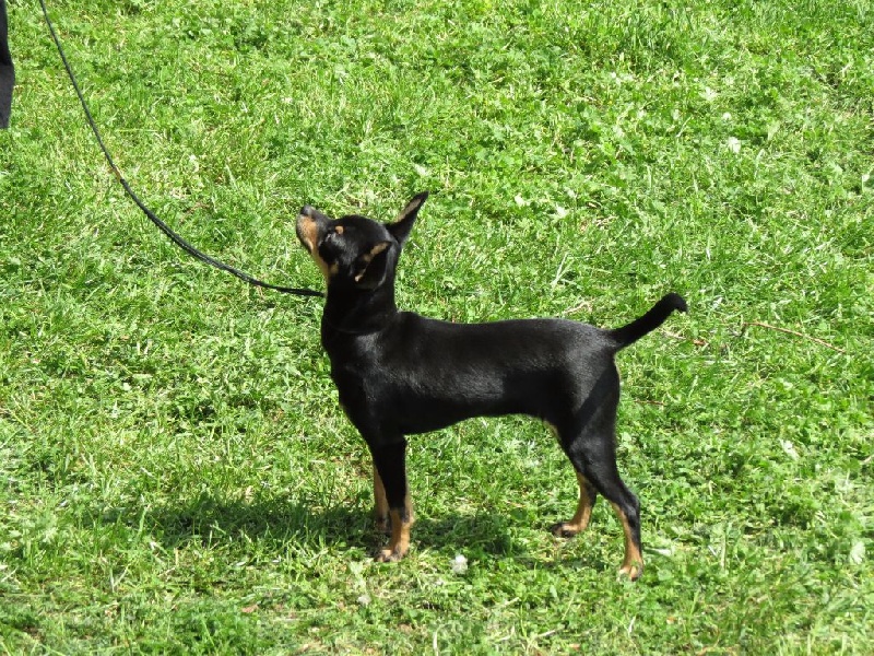 Noir et feu. Excellent sujet bien construit. Excellente tête avec superbes oreilles. ?il bien foncé. Excellent rapport crâne / chanfrein. Excellente sortie d'encolure. Antérieurs bien parallèles. Poitrine déjà bien développée. Joli dessus, fouet bien inséré. Excellente angulation arrière. Joli petit sujet d'avenir. Excellent mouvement.