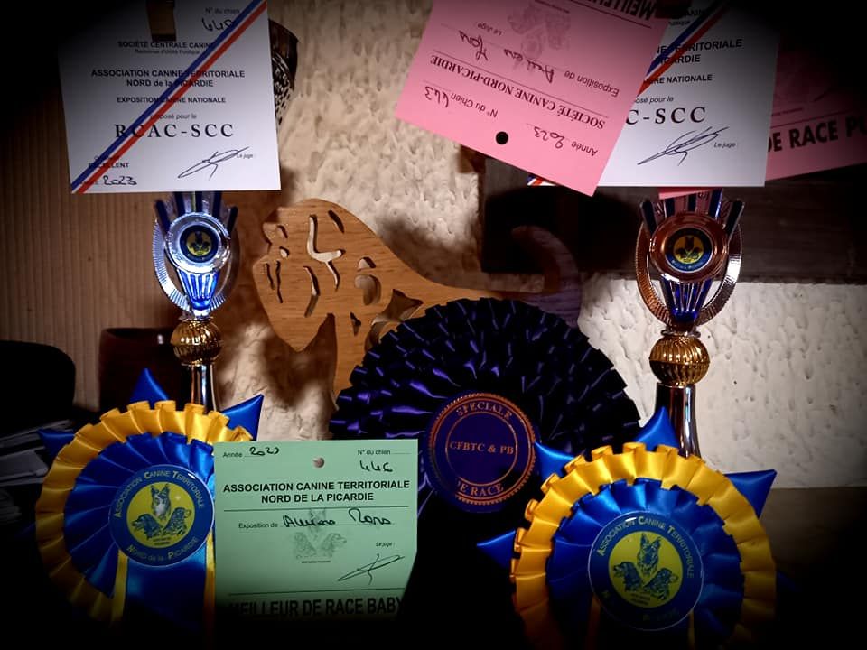 Excellent format et ossature, grands beaux yeux sombres,, excellent prognathisme et largeur de mâchoire, excellente ligne menton, truffe et front, excellente largeur de crâne, petites oreilles, jolie sortie d'encolure, le dos est solide, excellente poitrine dans ses 3 D, excellente attache de fouet et arrière main, excellente démarche avec belle pulsion, excellent port de queue.