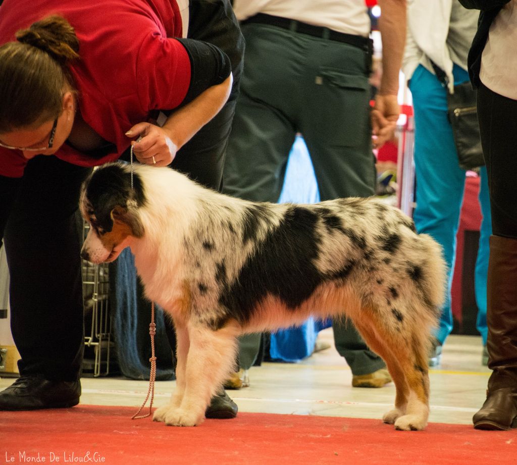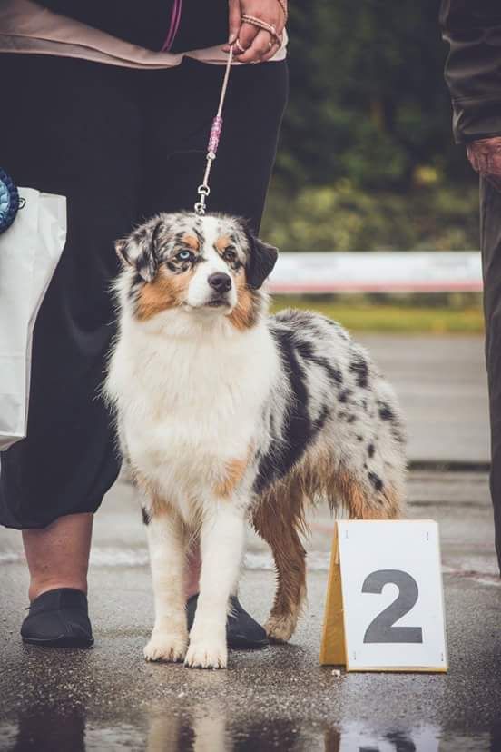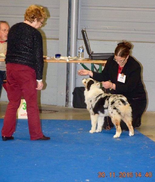 Bleu merle.Très joli bébé. Bcp de substance.Un très heureux caractère.jolie tête.Mais jaimeraiun peu plus d'encolure.Exc fouillée
