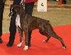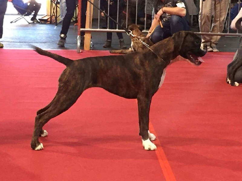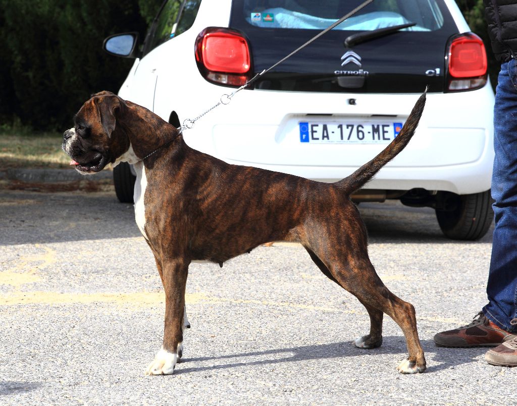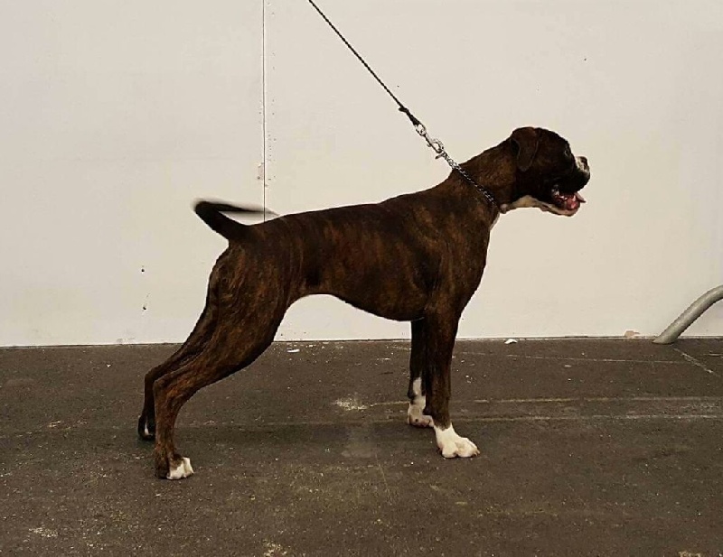 Bringé foncé sur fond or marqué en blanc - Jolie tête typique - bon prognathisme - menton marqué - yeux corrects - encolure assez sèche - Bonnes épaules, ossature et pieds - Très bonnes constructions et angulations - Excellente démarche - Fouet gai en mouvement
