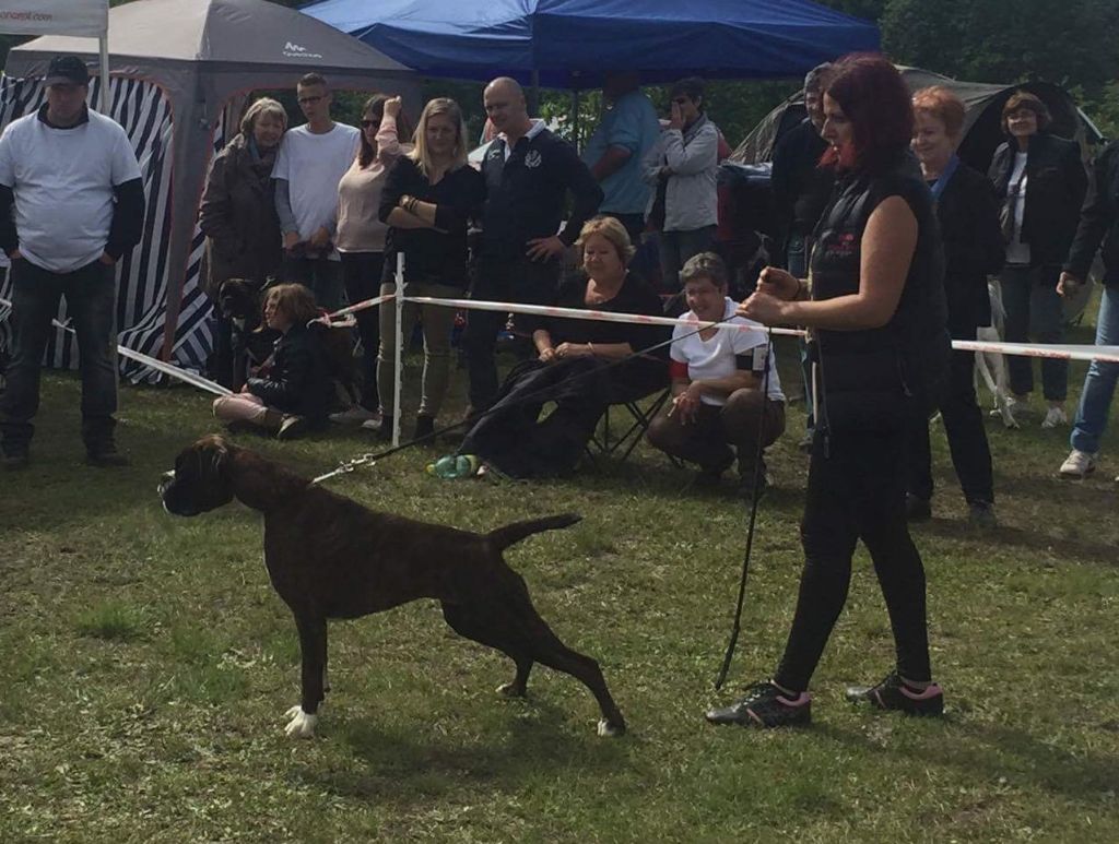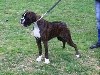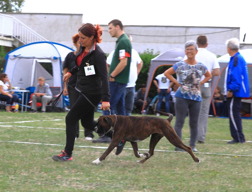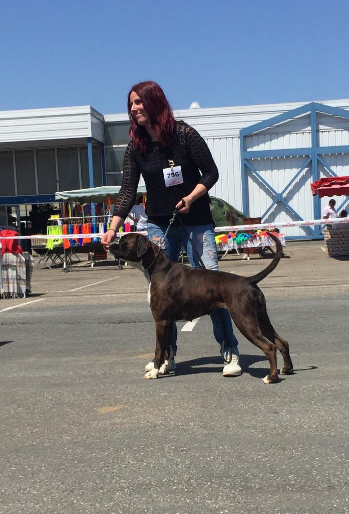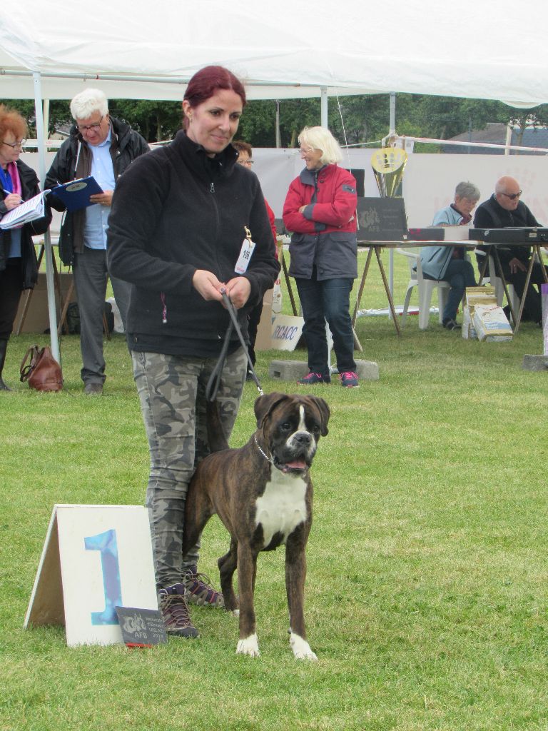 24 mois - bringé moyen fond cuivre marqué en blanc - grande - bonne ossature - pas tout à fait carré - tête typée - museau plein en rapport - stop et menton bien marqué - chanfrein un peu court -oeils foncés bien positionnés - denture moyennement large en ligne - Encolure sèche bien sortie - Très bonne hauteur et profondeur de poitrine - Très bonnes angulations AV, Excellentes AR - Allures libres avec bonne poussée