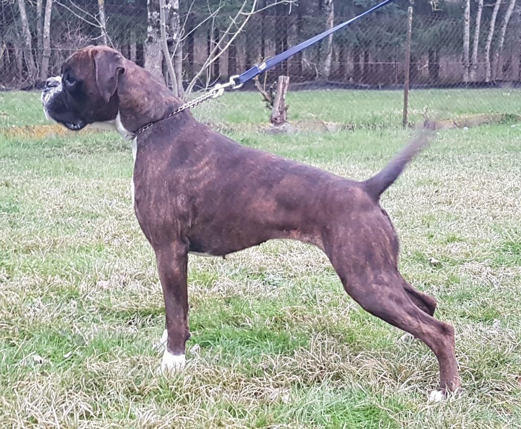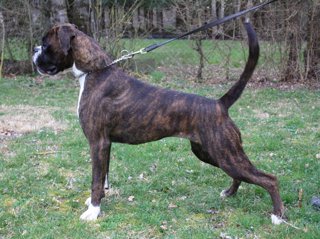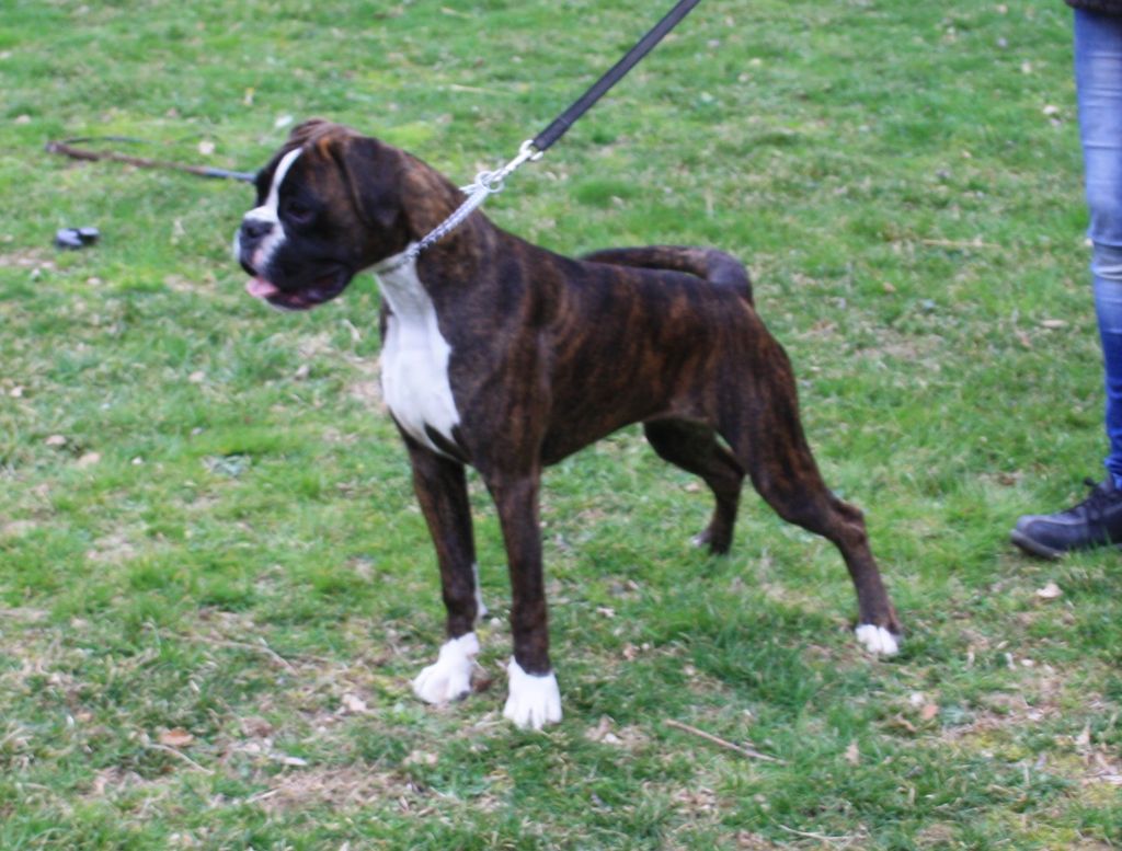Taille moyenne - Bringée foncée sur fond or - légèrement marquée en blanc - Tête typique - incisives alignées canines écartées - menton bien marqué - yeux corrects - belle encolure - B épaules ossature et pieds - poitrine, dos, croupe, fouet, angulations arrières correctes