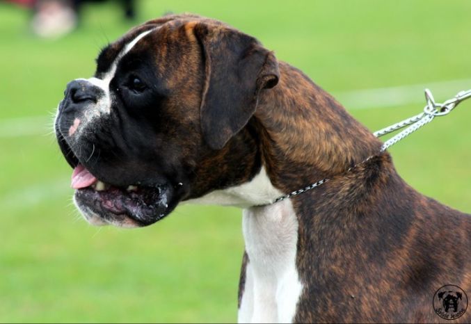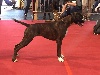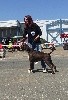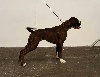 2 ans - Bringé cuivré marqué de blanc - Bonne taille - Bonne ossature - Exc tête typée avec Exc rapport crâne/museau - Stop et menton marqué - Oeil foncé avec belle expression - Denture presque large avec Exc prognathisme - Exc sortie d'encolure - Exc poitrine et poitrail - Exc dos - TB angulations AV - Exc angulations AR - J'aurais souhaité un peu plus d?amplitude aux allures