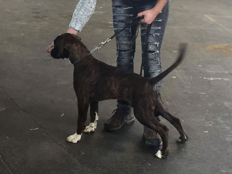 10 mois - Bringé foncé sur fond or marqué de blanc - De bonne taille et ossature - Construction presque carré - Exc type de tête avec Exc rapport crâne museau - Stop et menton marqués - grosse truffe avec narines bien ouvertes - Denture moyennement large allignées - Exc yeux sombres posés sur un crâne bien étroit - Encolure noble - Exc ligne de dessus et de dessous avec poitrine juste aux coudes - Exc Ang - Allures libres avec poussées suffisantes