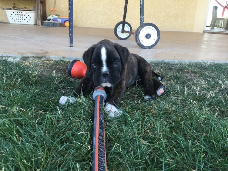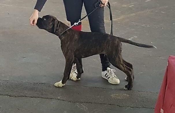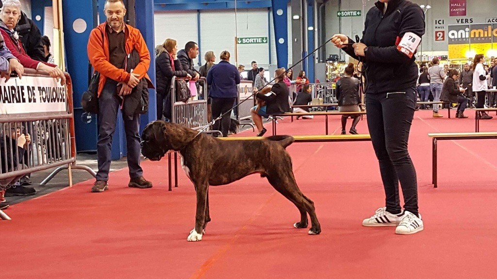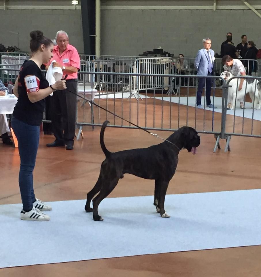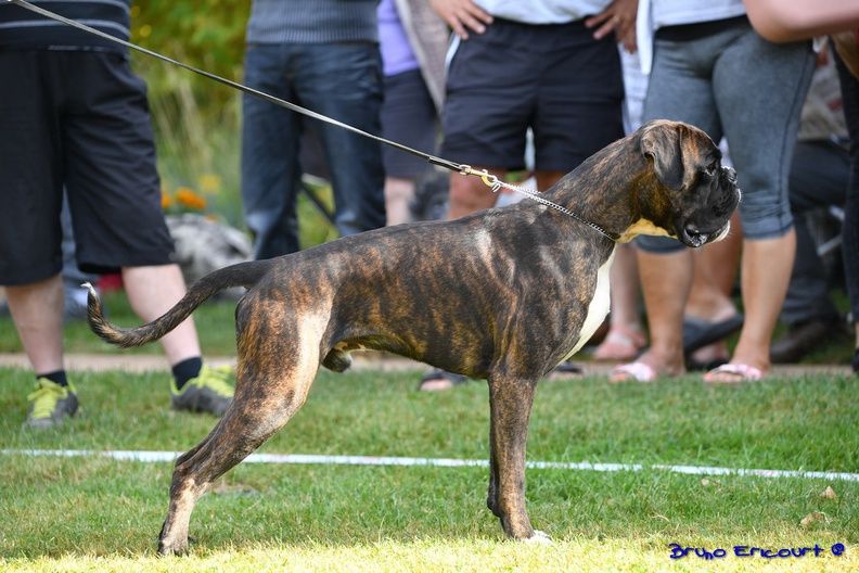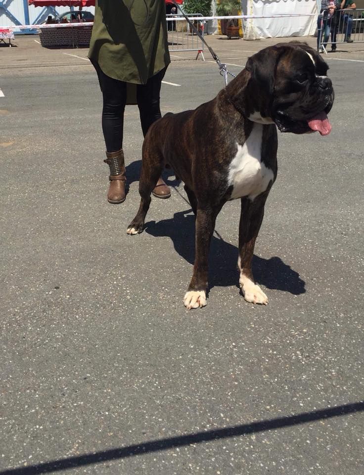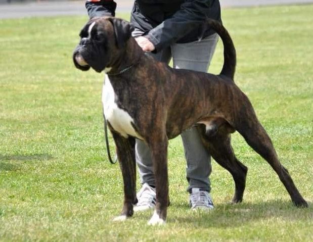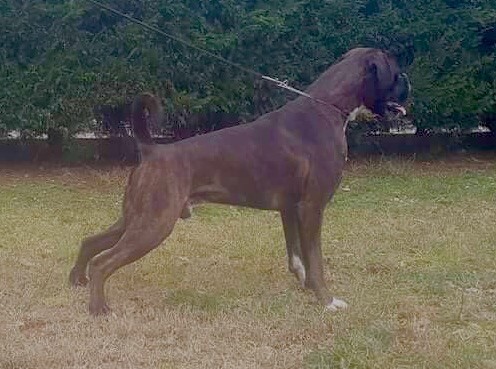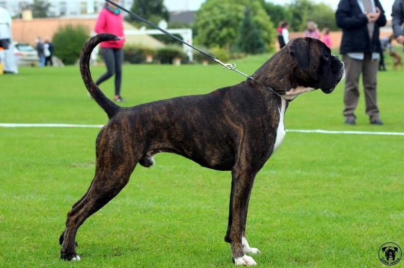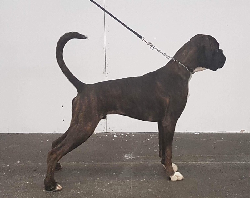 14 mois bringé soutenude construction carrée et harmonieuseexc tête typique avec très bon rapport crâne museau stop et menton très marqué museau cubique et pleindenture large alignée saineexc yeux sombres divisés par un sillon frontal prononcéencolure puissante et élégante garrot bien marquéexc ligne de dos déjà ferme très bonne ligne de dessous avec poitrine encore juvénileangulation avant un peu ouverte exc angulation arrière aux allures le dos flotte encore un peupoussée suffisante