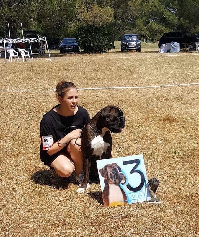 Bringé foncé sur fond doré peu marqué en blancTête typique une peu large en crâneBon prognathisme et alignement chanfrein un peu court menton très marqué encolure légèr chargéeB épaules ossature pieds un peu faible des métacarpes poitrail poitrine dos ang correctes, fouet gai