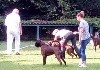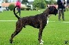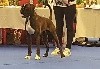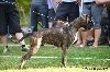 13 mois (61cm) bringé sur fond cuivre marqué de blanc déjà grand et puissant construction carrée excellent type de tête avec excellent rapport crâne museau stop et menton bien marqués denture moyennement large alignée avec fort prognathismechanfrein légèrement court excellent yeux forme et couleur encolure puissante mais élégante chanfrein marqué excellente ligne dessus ligne dessous encore juvénile angulations AV AR excellentesallure libre avec belle couverture manque de fermeté (normal pour l'âge)