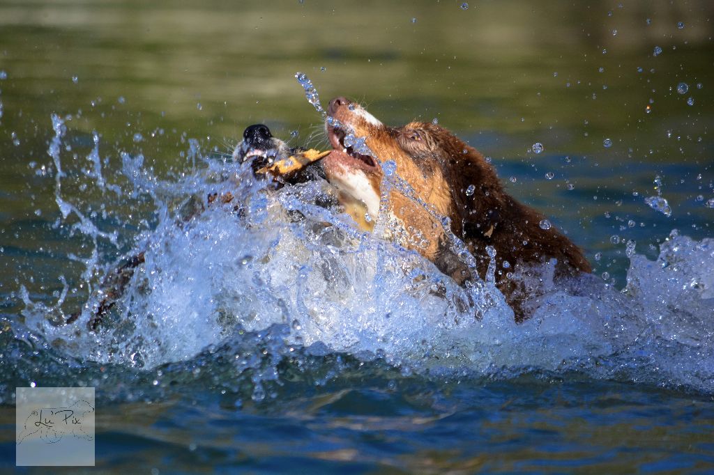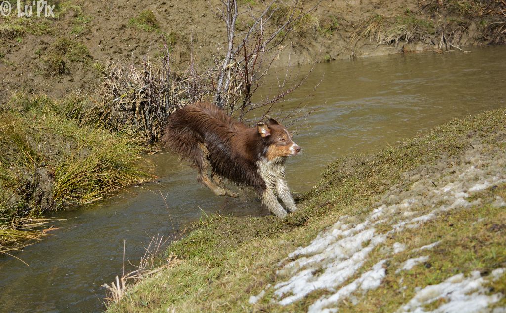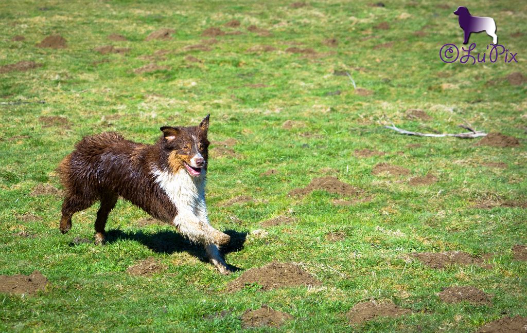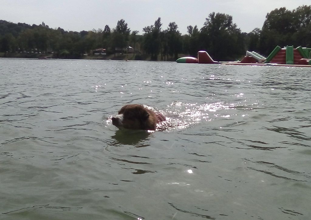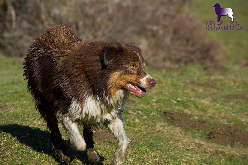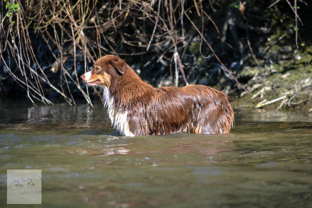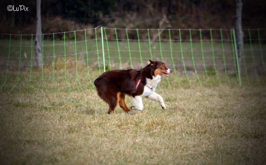 Elle est à l'aise en toute circonstace, expo, rando, course à pied, balade en ville, au milieu des chevaux... mais ce qu'elle adore c'est courrir comme une folle avec les copains chien en balade au bord de l'eau!