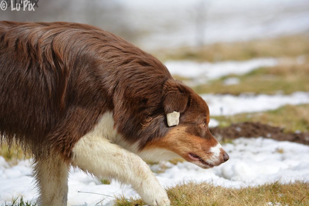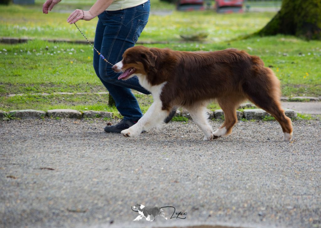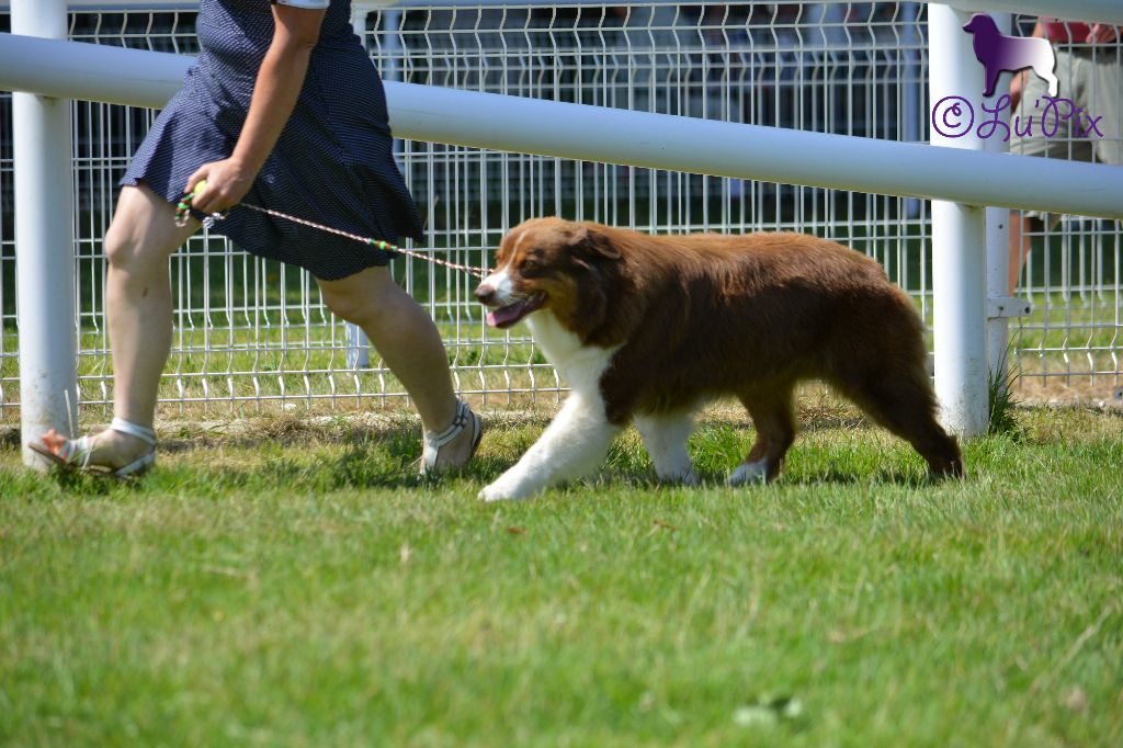 DCC, belles proportions de tête avec un stop correct. Oreilles attachées un peu bas, mais mobiles.Belle encolure, ligne de dos préférée pus soutenue, épaules préférée un peu plus angulée, arrière main correcte, belle qualité de poils, aller/retour moyen, mouvement allure dynamique, sujet équilibré, facile à juger.