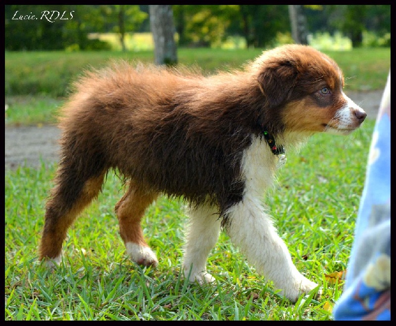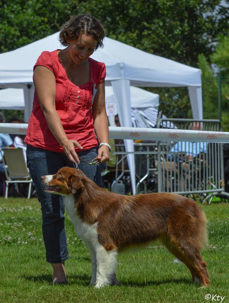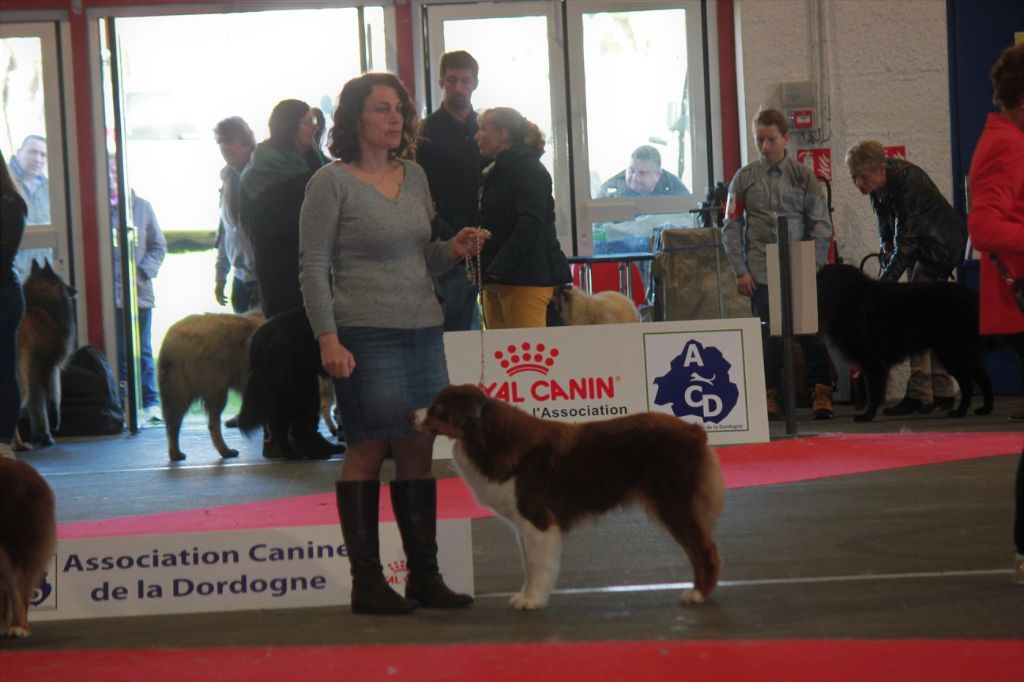 DCC - Rouge tri de couleur chaude - fourrure en mueBonne taille et construction harmonieuseExcellente croupe, poitrine aux coudes - Très bon poitrail.Excellentes angulations, ossature moyennes, encolure dégagée et bien insérée.Tête féminine, bien proportionnée. Excellent parallélisme, stop moyen, Exc oreille, Exc oeil.Excellent aplombs, Excellentes allures, bien qu'un peu raide à l'arrière (chienne en chaleurs)