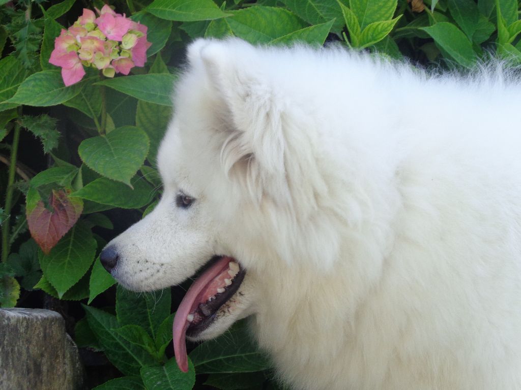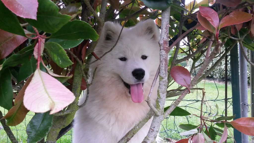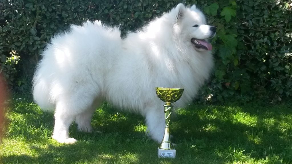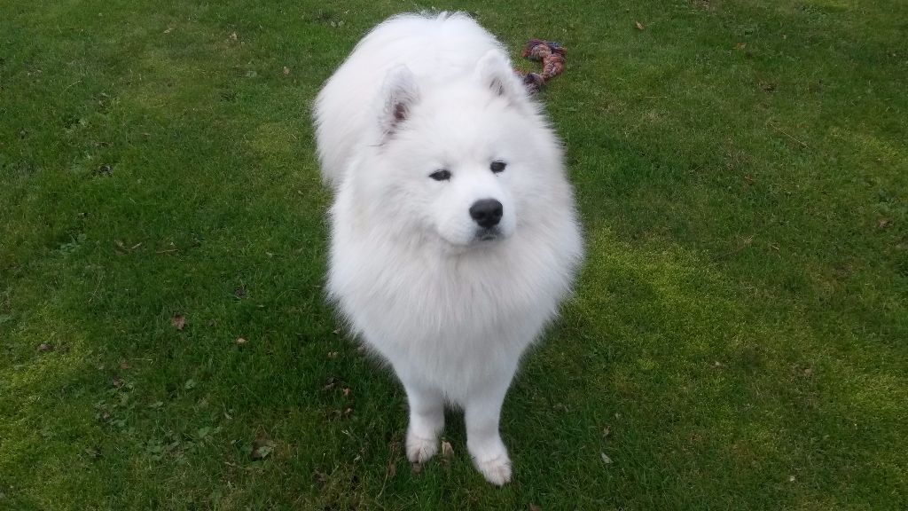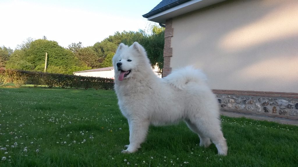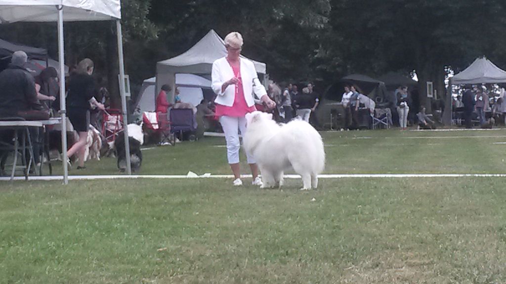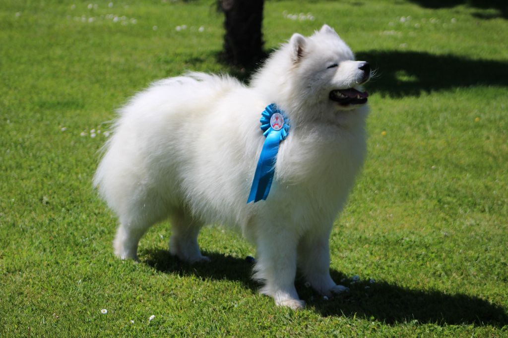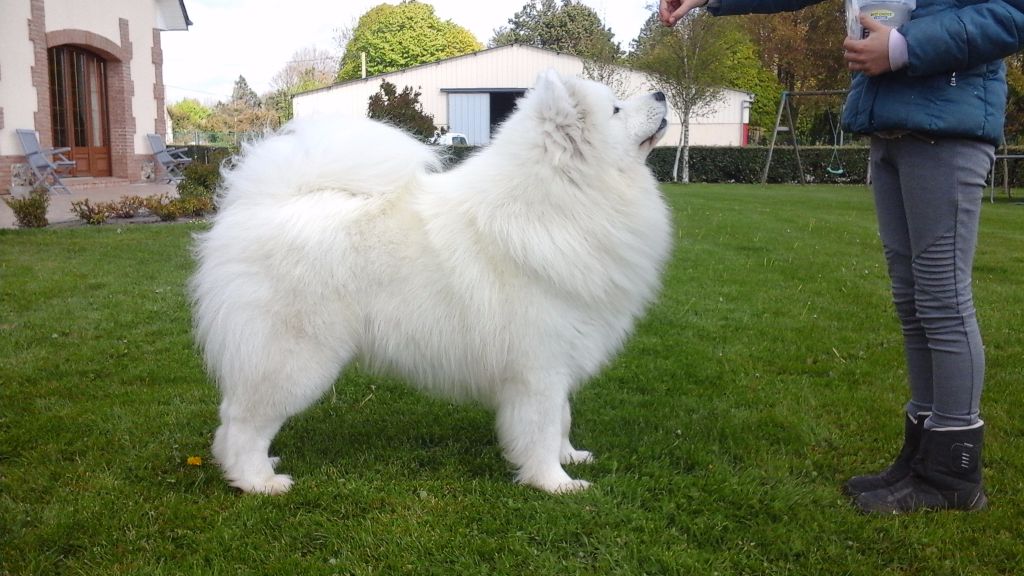 Se déplace bienB en poilTête B expression mâleSourire samoyèdeOeil foncéBonne encolureBonne ossaturebons aplombsB attache de queue