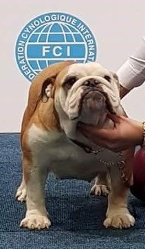 Fauve/Rouge à panachures blanches.Bonne ossature.Légère tendance à l'obésité .Tête avec une bonne expression typique .Bonne pigmentation .Mandibule un peu trop étroite.Bonne courbure de la mandibule .Bons yeux bien foncés et sains.Bonnes oreilles en rose bien placées. Bonne ligne de dessus.Poitrine profonde et bien descendue .Bons aplombs avant.Bonnes épaules bien rapportées.Bon arrière-main.Bonne angulation arrière.Queue bien placée.Bonnes allures typiques.Serre un peu à l'avant.Excellente présentation .Respiration un peu difficile (raclement ) (NB : cela faisait 1h30 quon attendait en plein soleil !!!! ) Bien développé pour son âge.