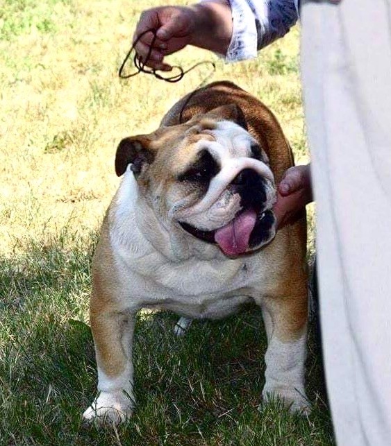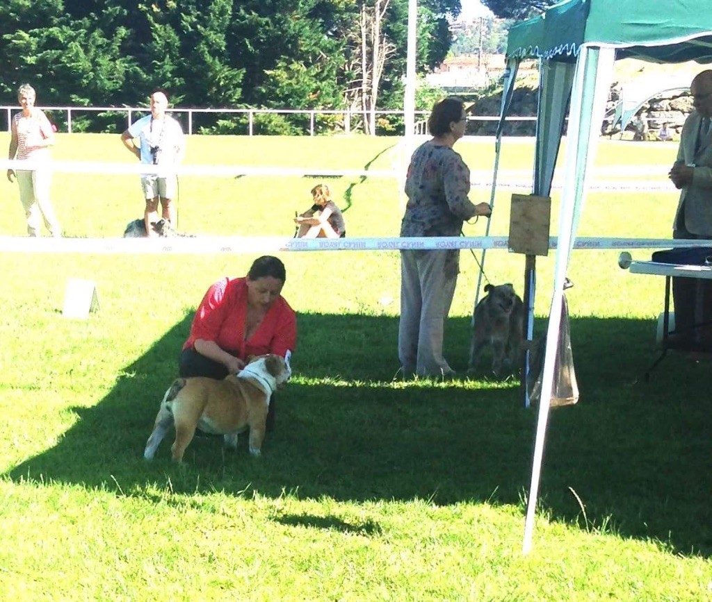 " 7 mois , bonne taille et couleur, tête typique Prognathisme un peu important, canines bien écartées Menton marqué , yeux et oreilles correctsPoitrail assez large, épaules en place et bien rapportéesPoitrine correcteDos typique Queue et angulations arrières correctesBonne démarcheBouche ouverte pendant le jugement "