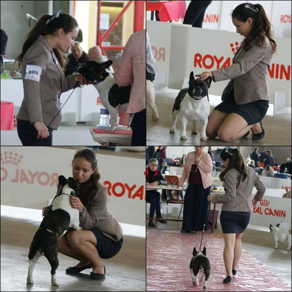 Sujet très féminin très bonne ligne de dos queue très courte le rein est trop creux exc ossature. TB aplombs avants. Angulation AR un peu justes. JHolie tête Denture correcte. Exc oeil. Bon mouvement.Bien entendu la juge vu qu'elle a eu une portée un peu plus de 2 mois avant. (maigreur)