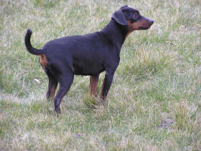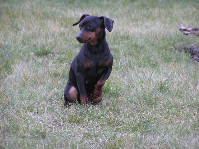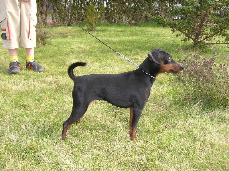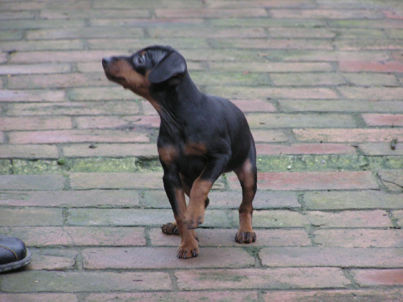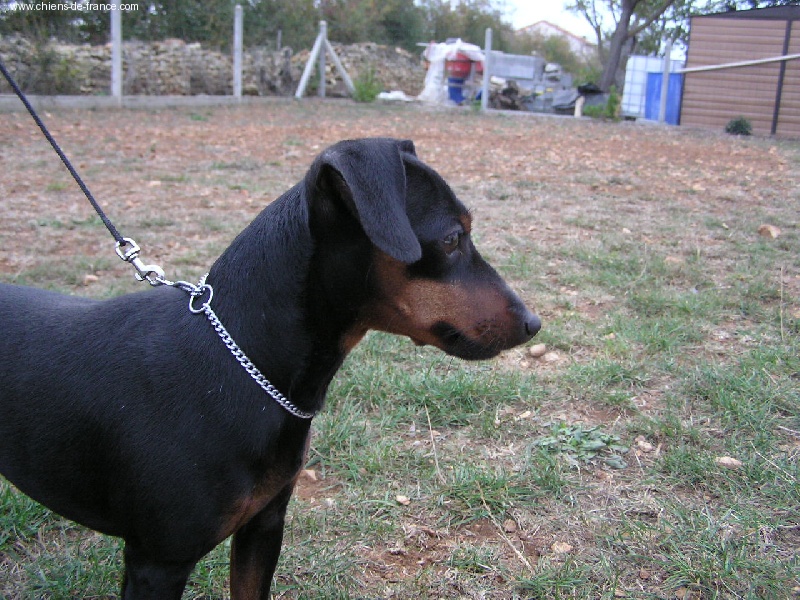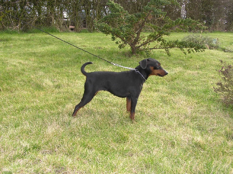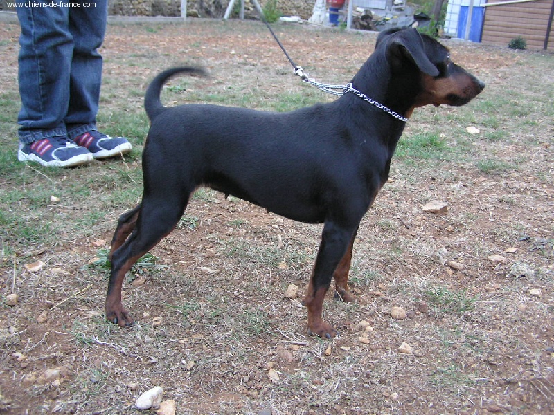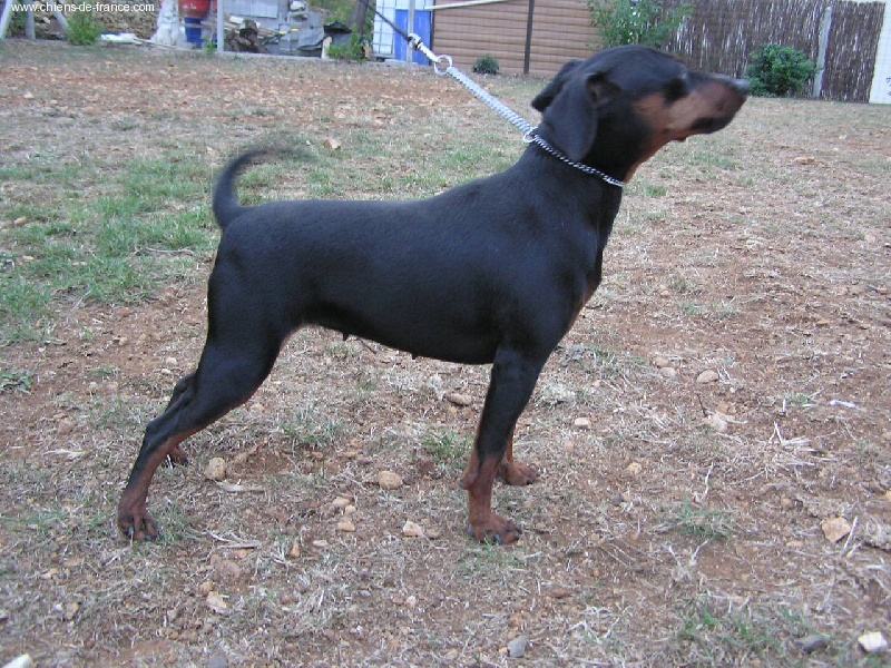 RESULTAT OBTENU lorsqu'USTOPIE APPARTENAIT A L'élevage DES PINSCHEBOULES !!!!16 mois DCC, belle denture blanche et solide. Feux trés foncés qui pourraient etre plus rouges. Bon //en tete, oreilles au port correct. Encolure TNB, dos tendu. Poitrine d'un bon volume. TB croupe. Queue non coupée bien portée. Aplomps réguliers et ex angulation. Marche bien. Construction assez courte.
