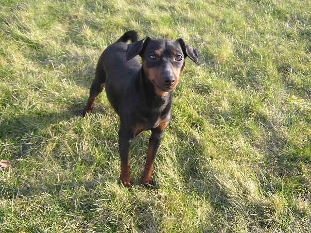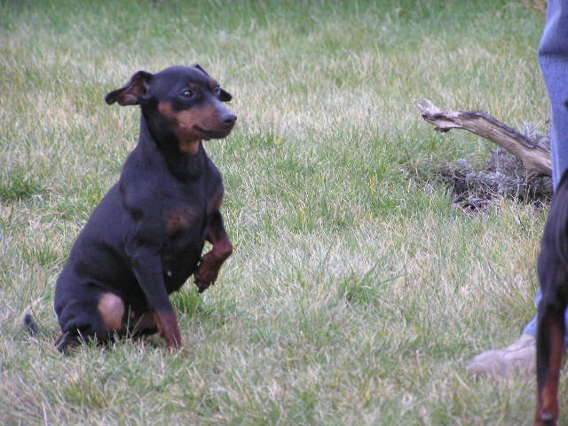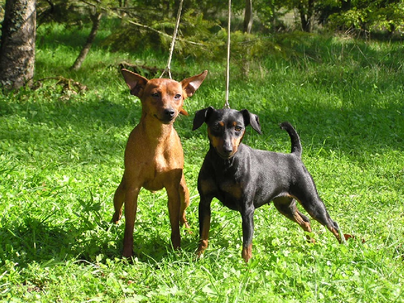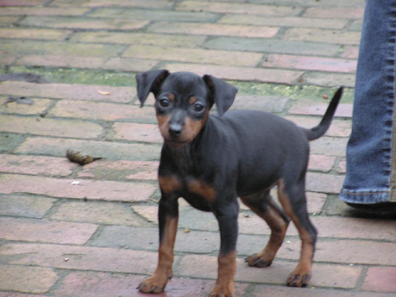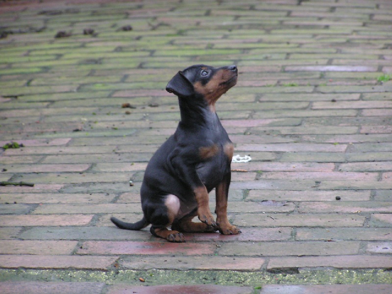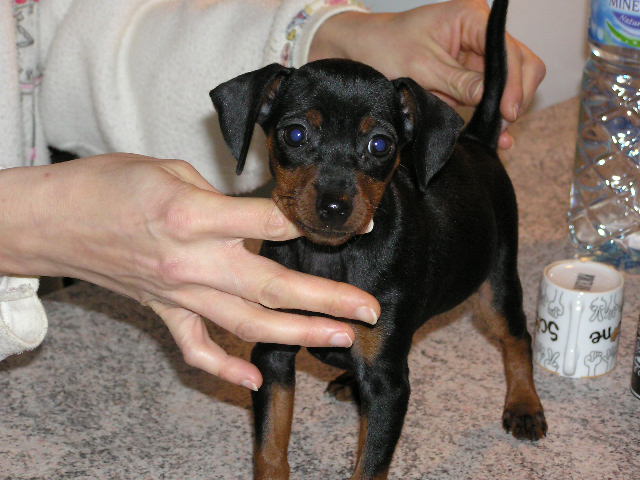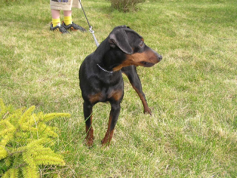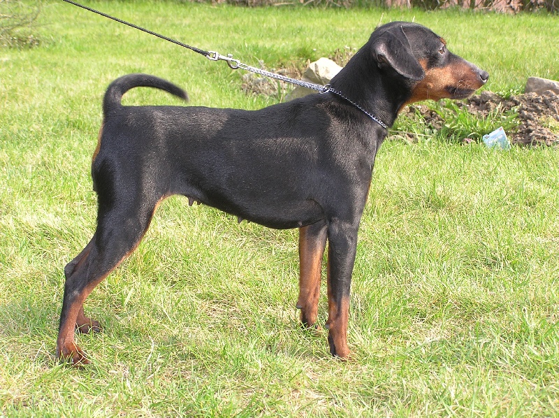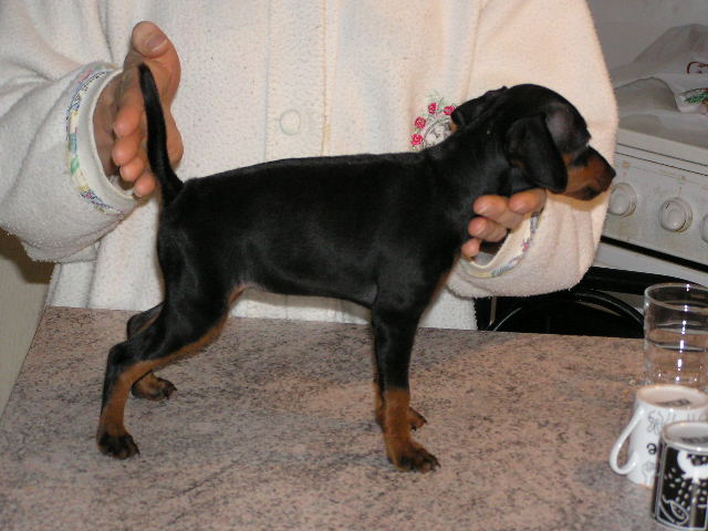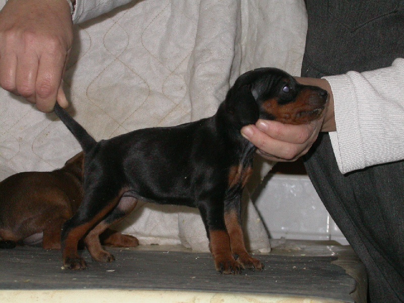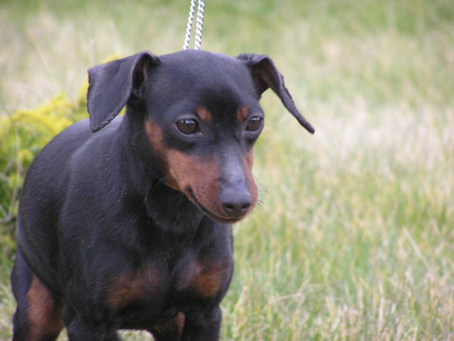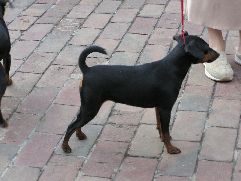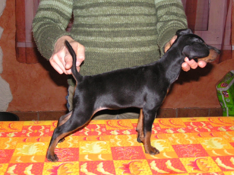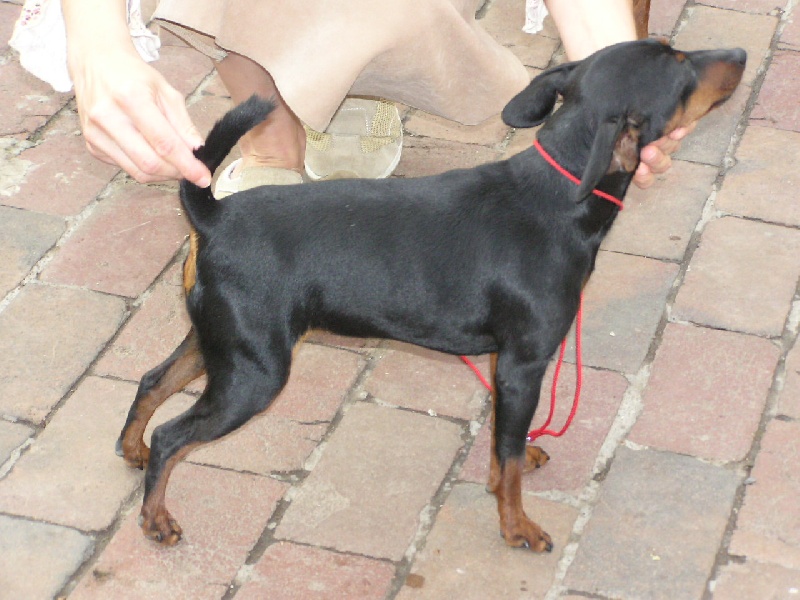 RESULTAT OBTENU lorsqu'USTOPIE APPARTENAIT A L'élevage DES PINSCHEBOULES !!!!DCC; feux bien marqués, petit modèle, oreilles et queue non coupées bien portées. Exc encolure. Construction carré. Exc croupe, poitrine profonde et de bon volume. Ossature en rapport avec sa taille; Aplombs av et ar réguliers. Exc A/R. EXC mouvements réguliers