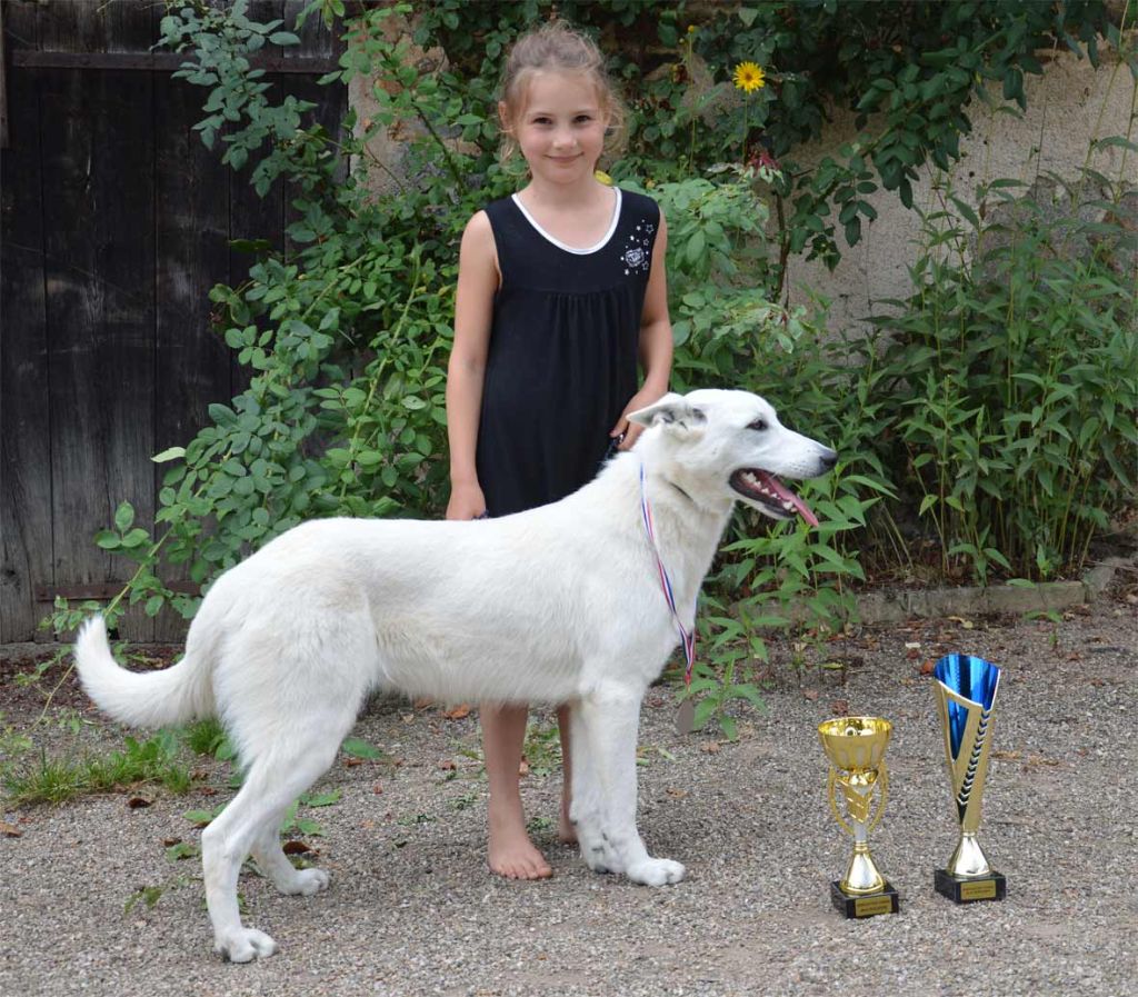 féminine, joli sujet, excellente encolure, chienne de bonne longueur avec un heureux caractère. l'oeil pourrait être un peu plus en amande.