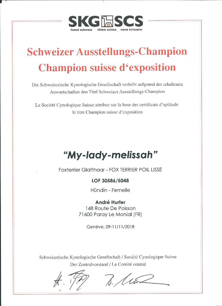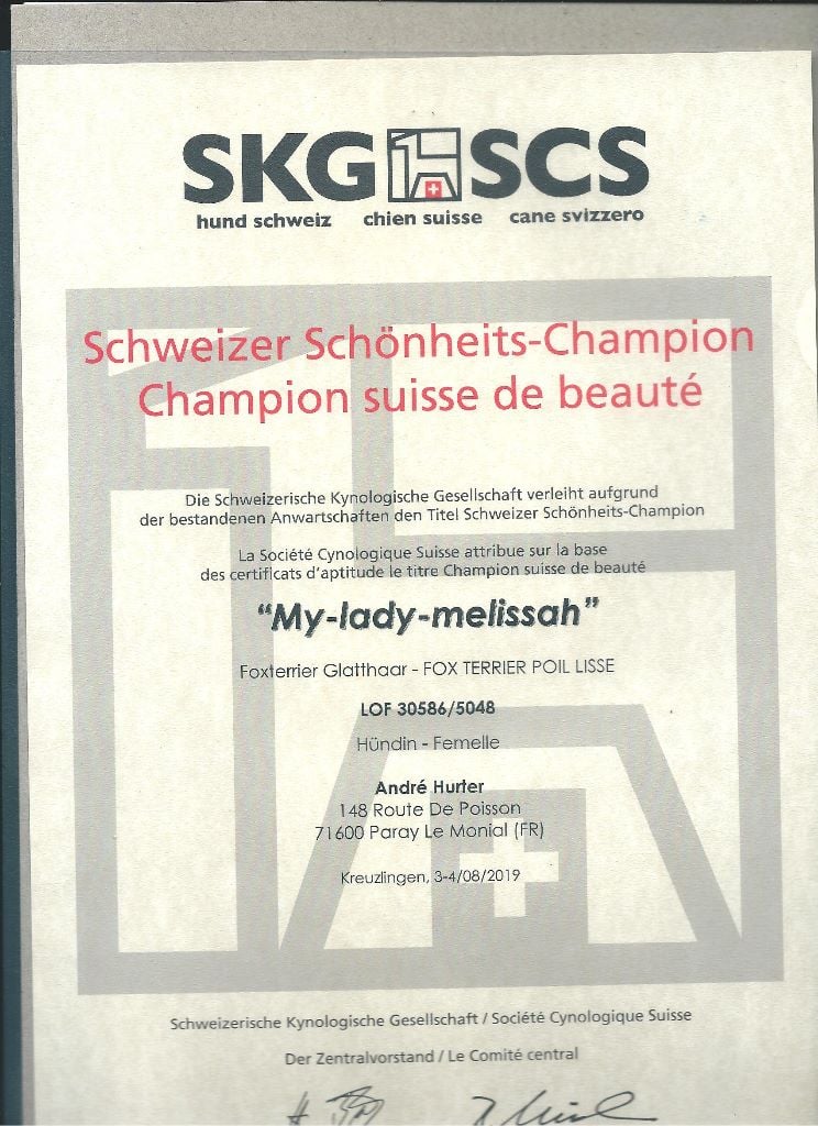 HOMOLOGATION DU TITRE DE CHAMPIONNE SUISSE D'EXPOSITION.