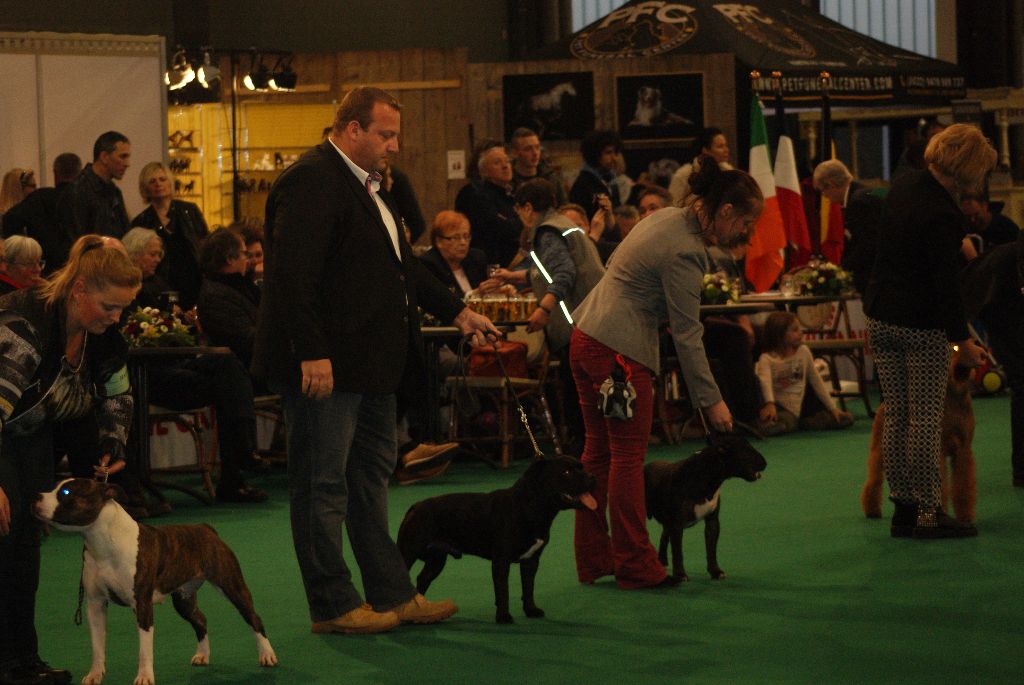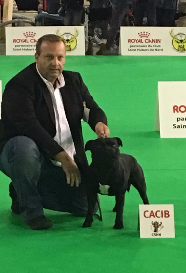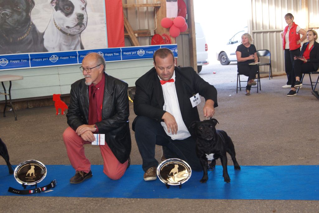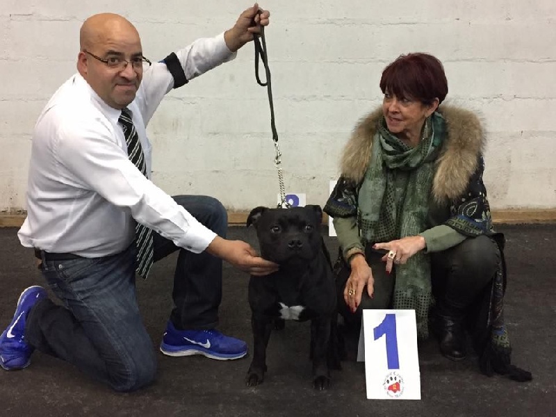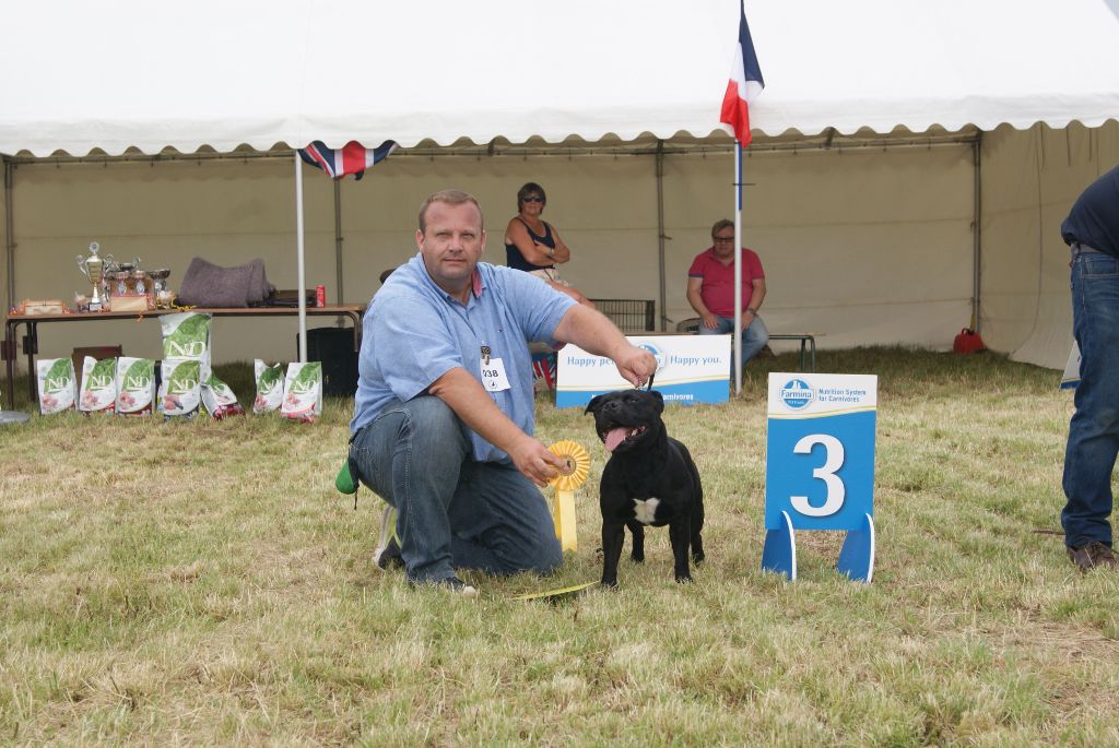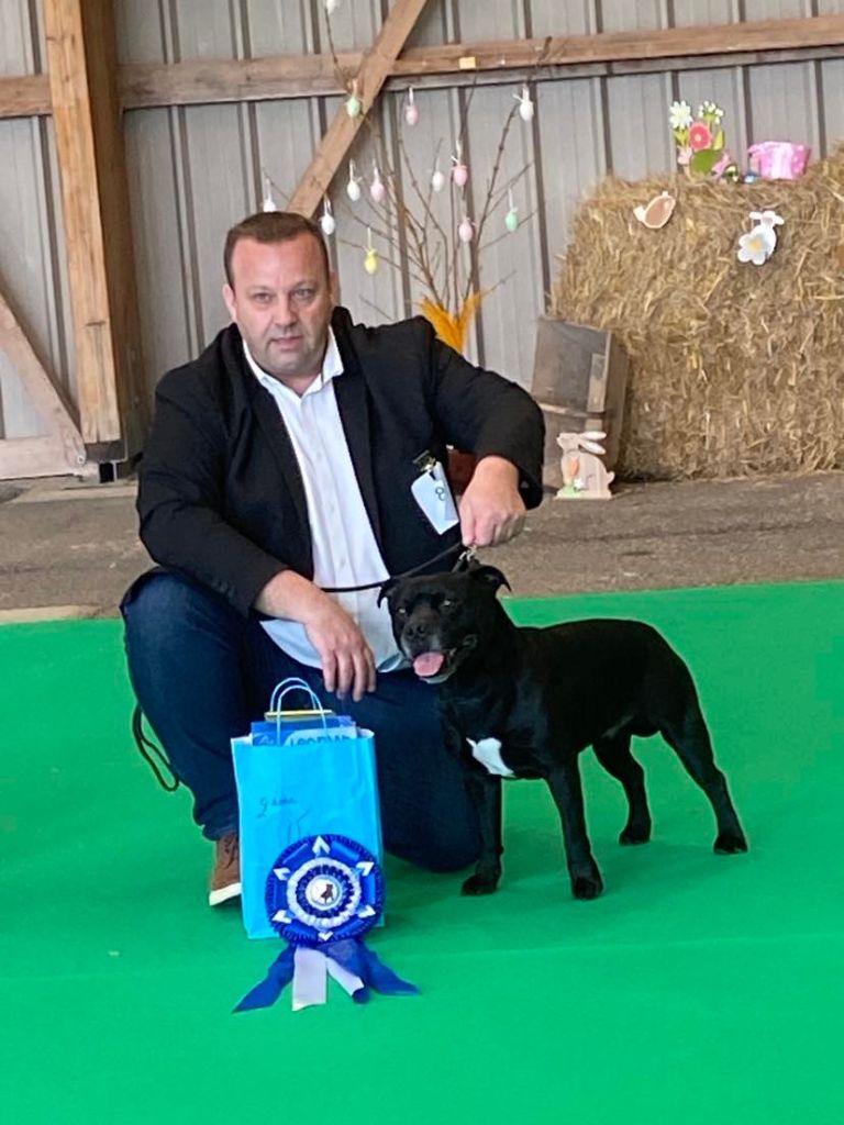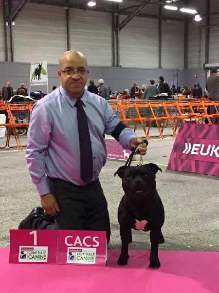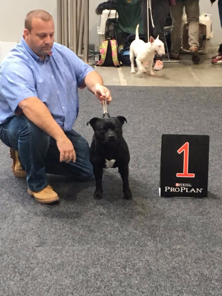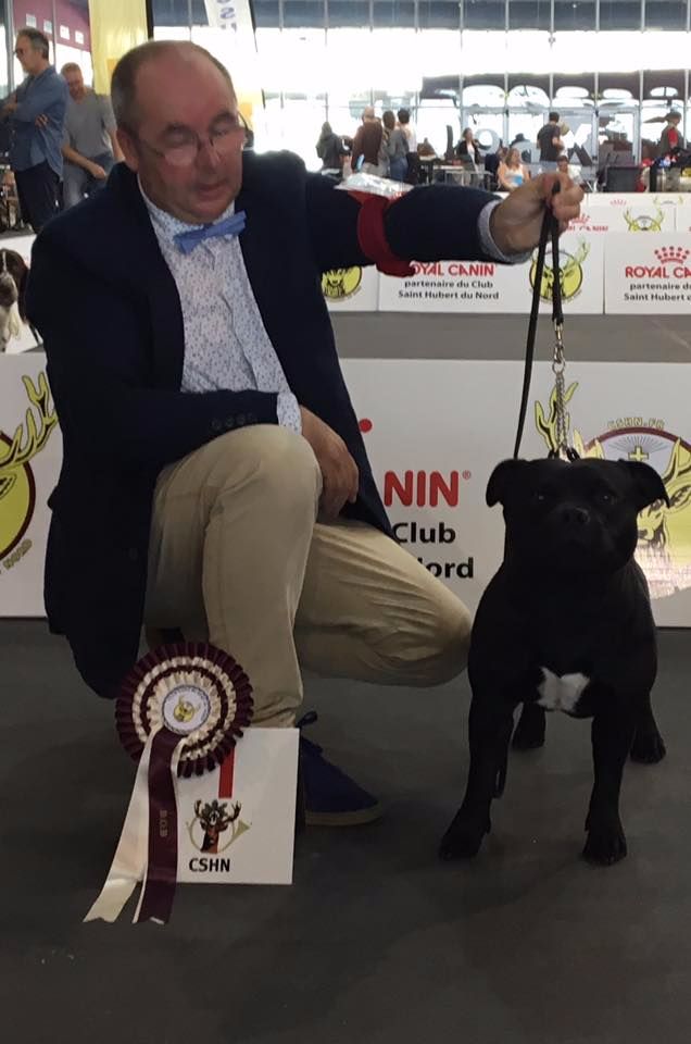handler et propriètaire : Christophe.C ils terminent ensemble : 1ex champion meilleur mâle meilleur staffie sur 77 merci aux juges MR triqueneaux et Mr madden