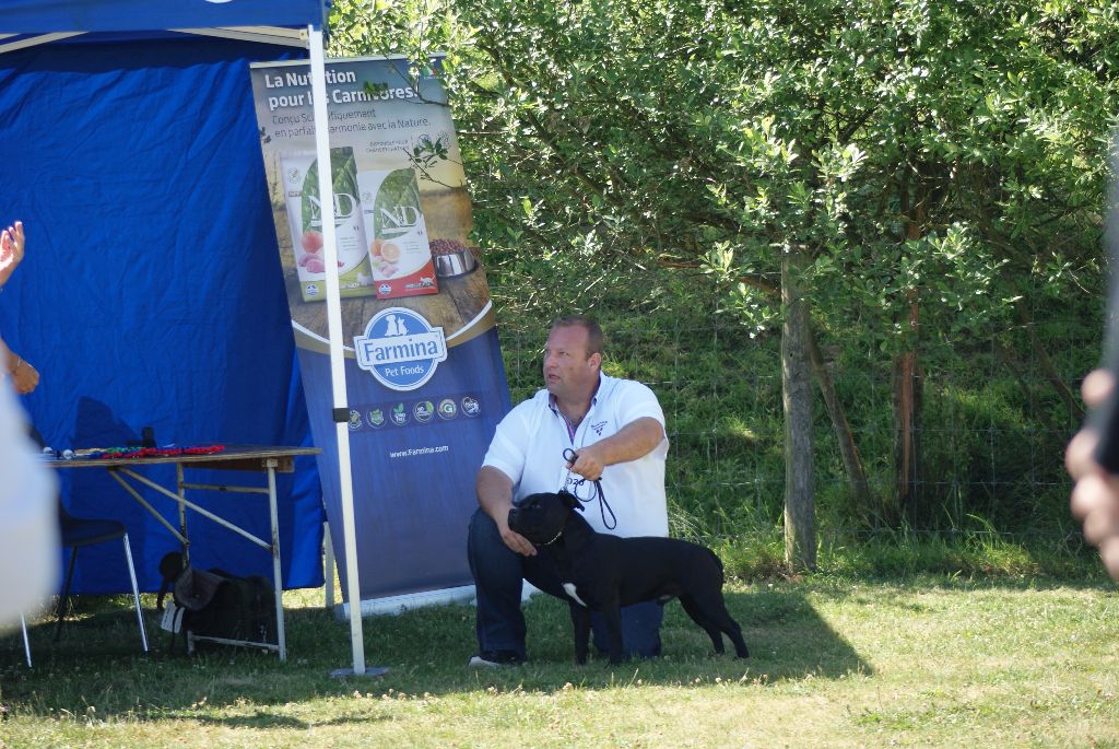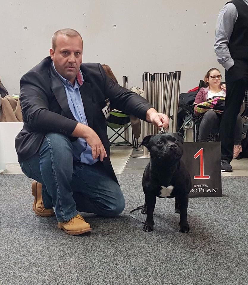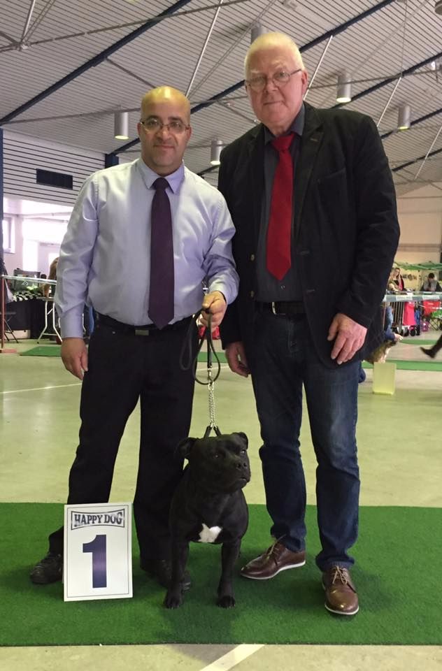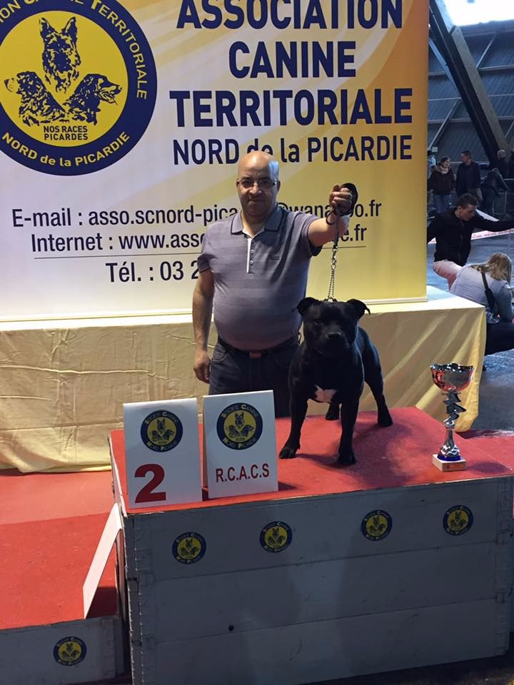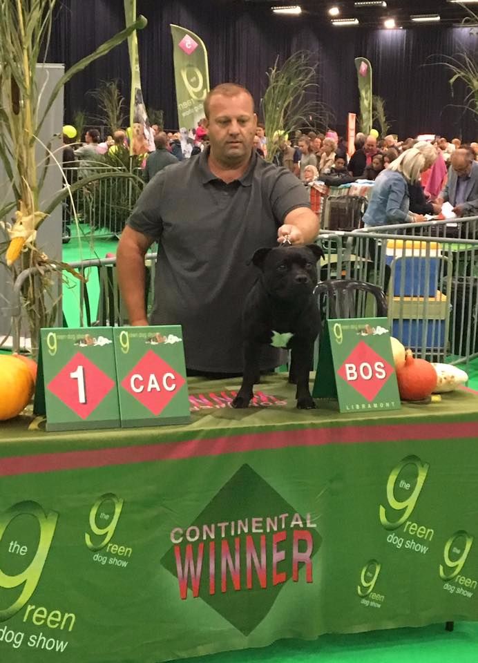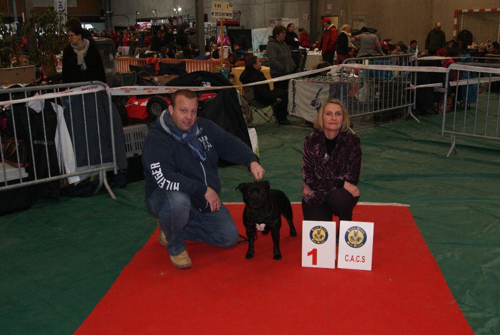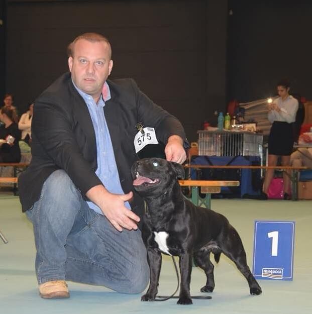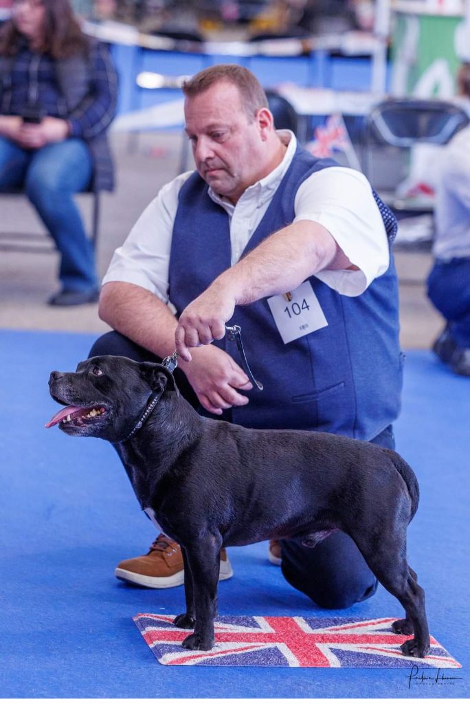 handler et propriètaire : Christophe.C ils terminent ensemble : 1ex champion meilleur mâle meilleur staffie sur 77 merci aux juges MR triqueneaux et Mr madden