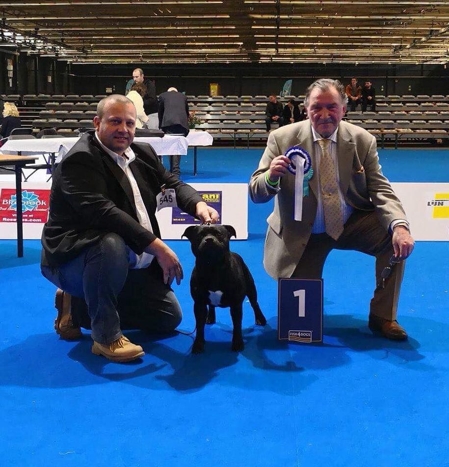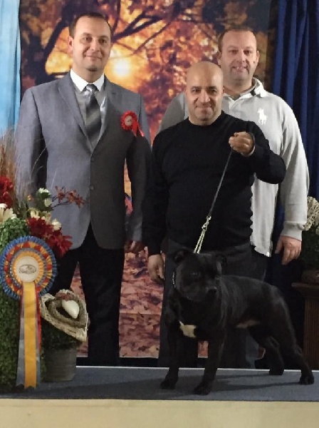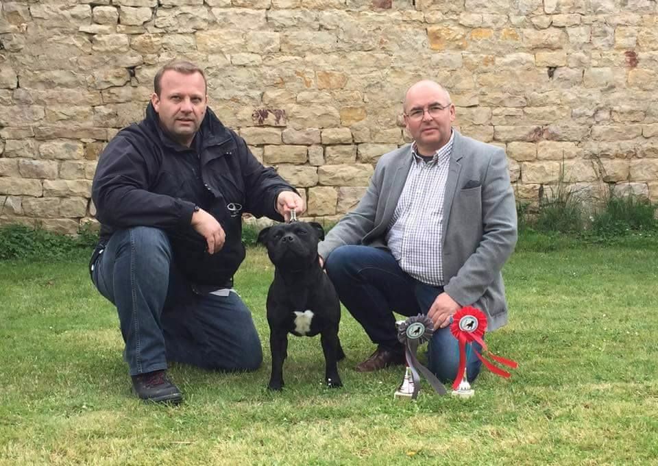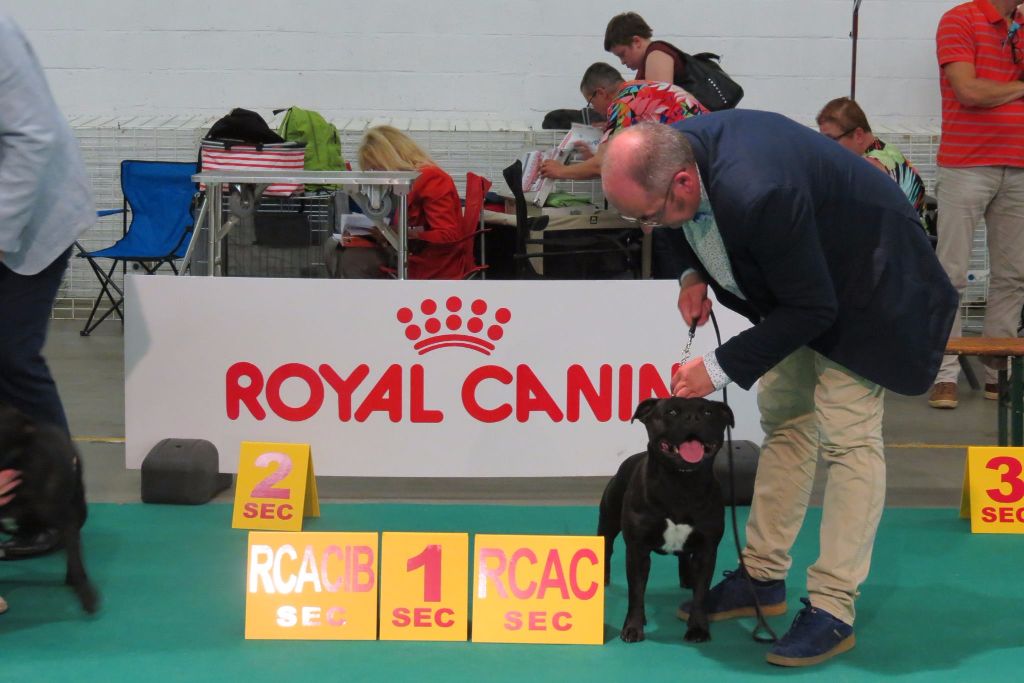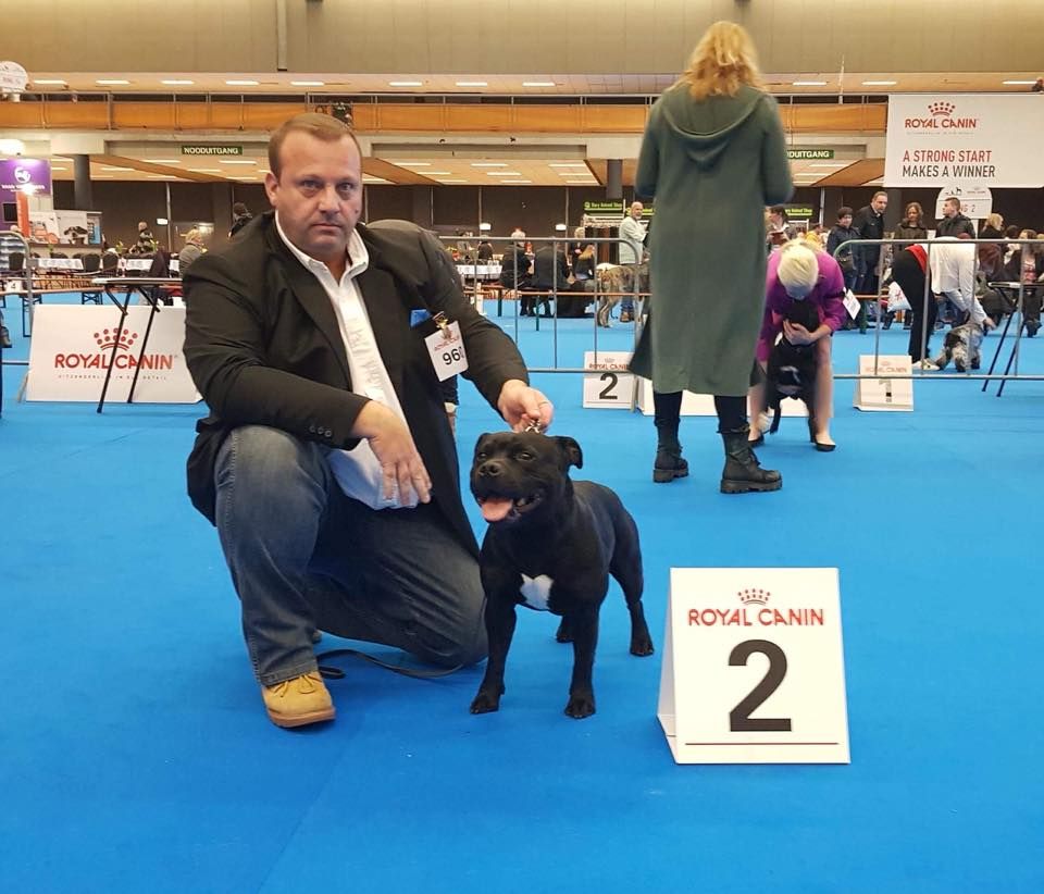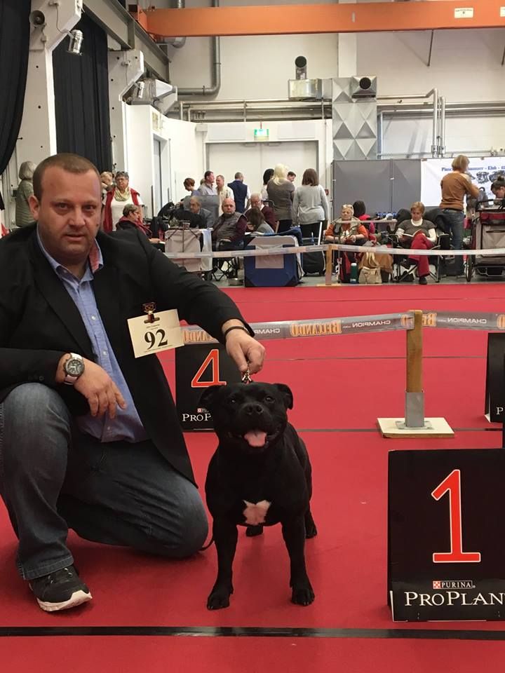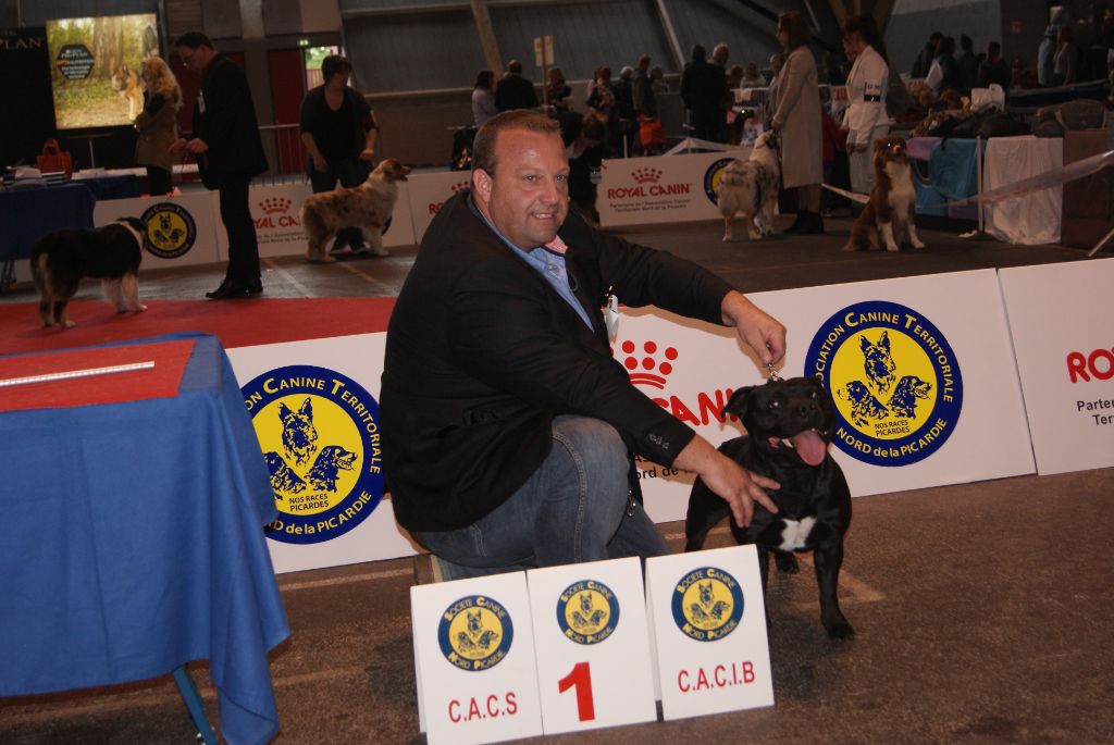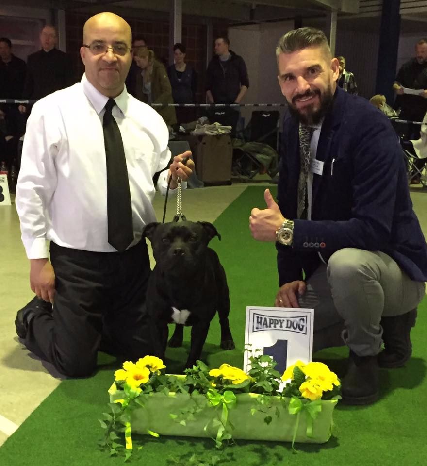 handler et propriètaire : Christophe.C ils terminent ensemble : 1ex champion meilleur mâle meilleur staffie sur 77 merci aux juges MR triqueneaux et Mr madden