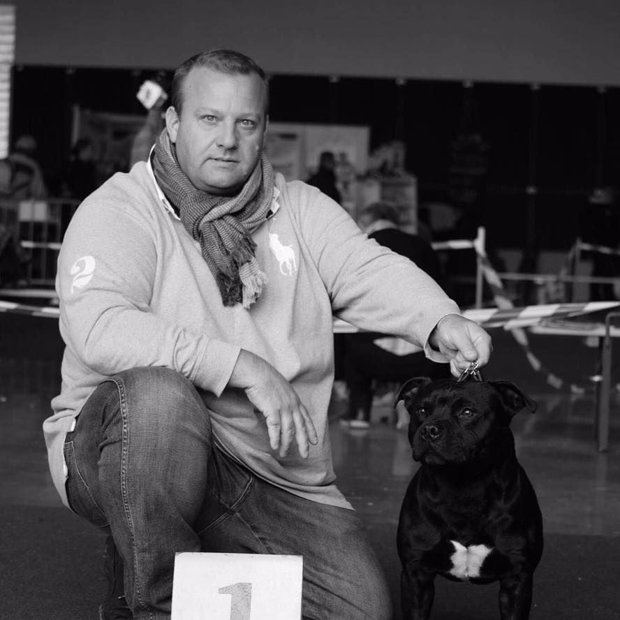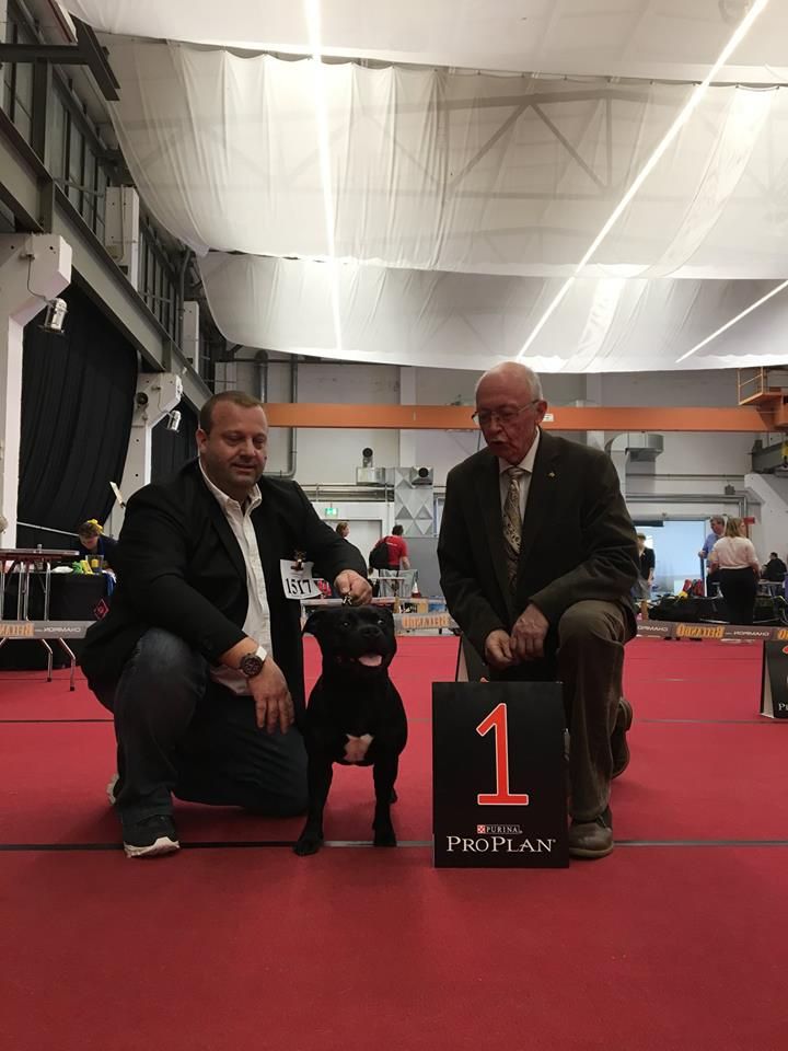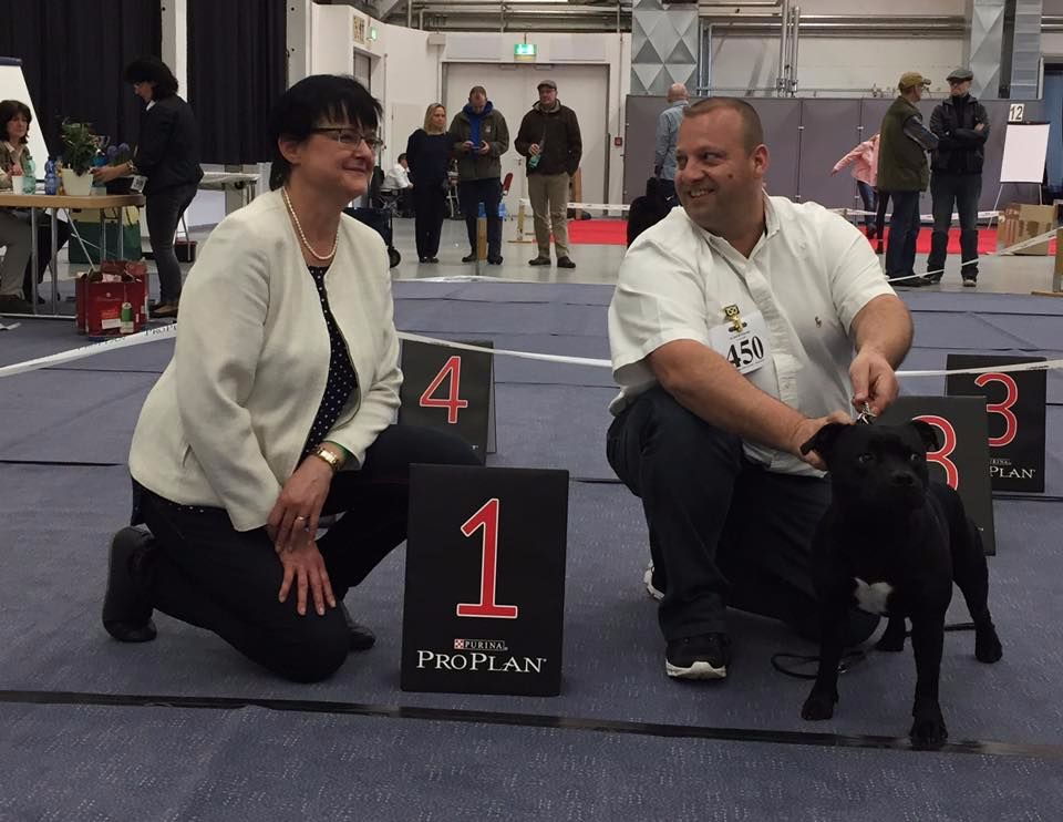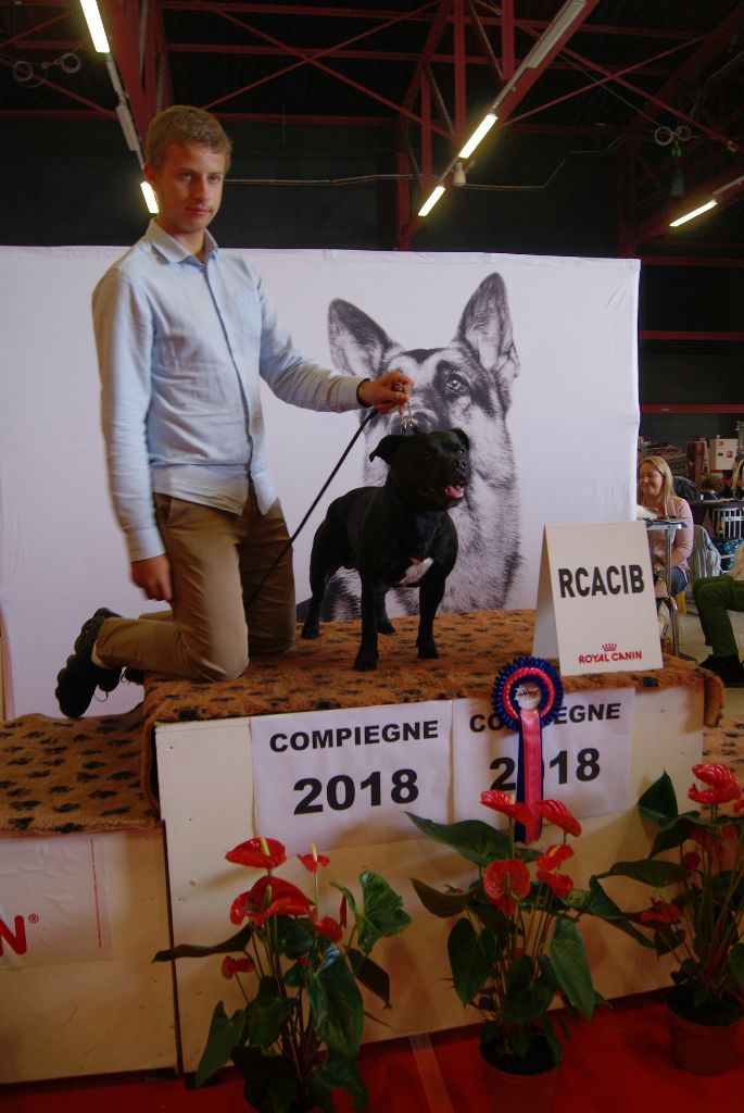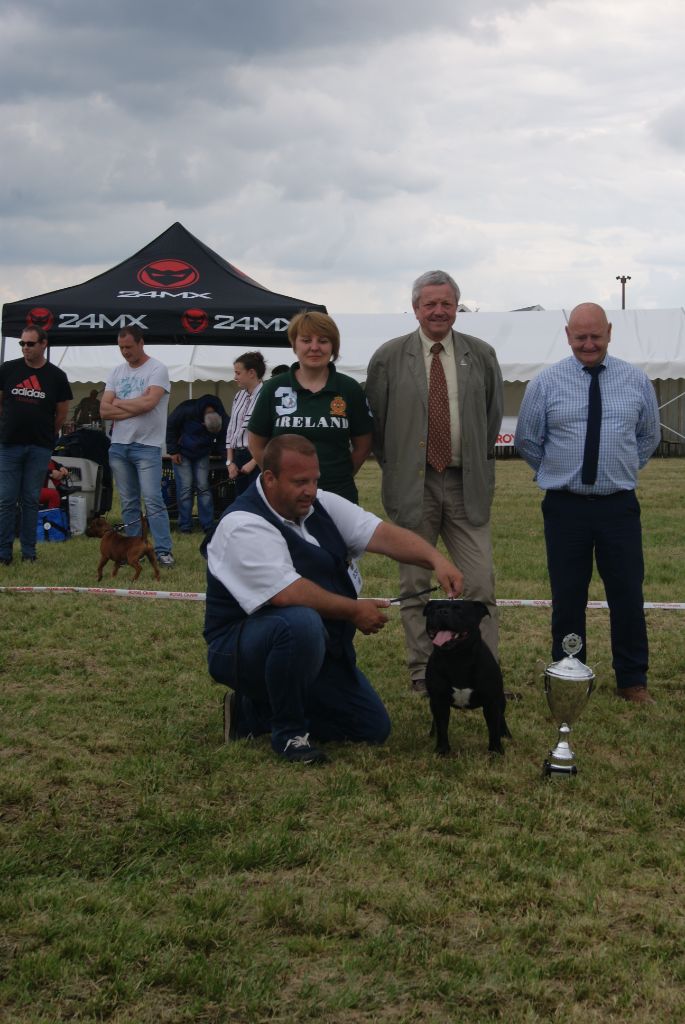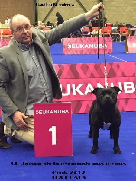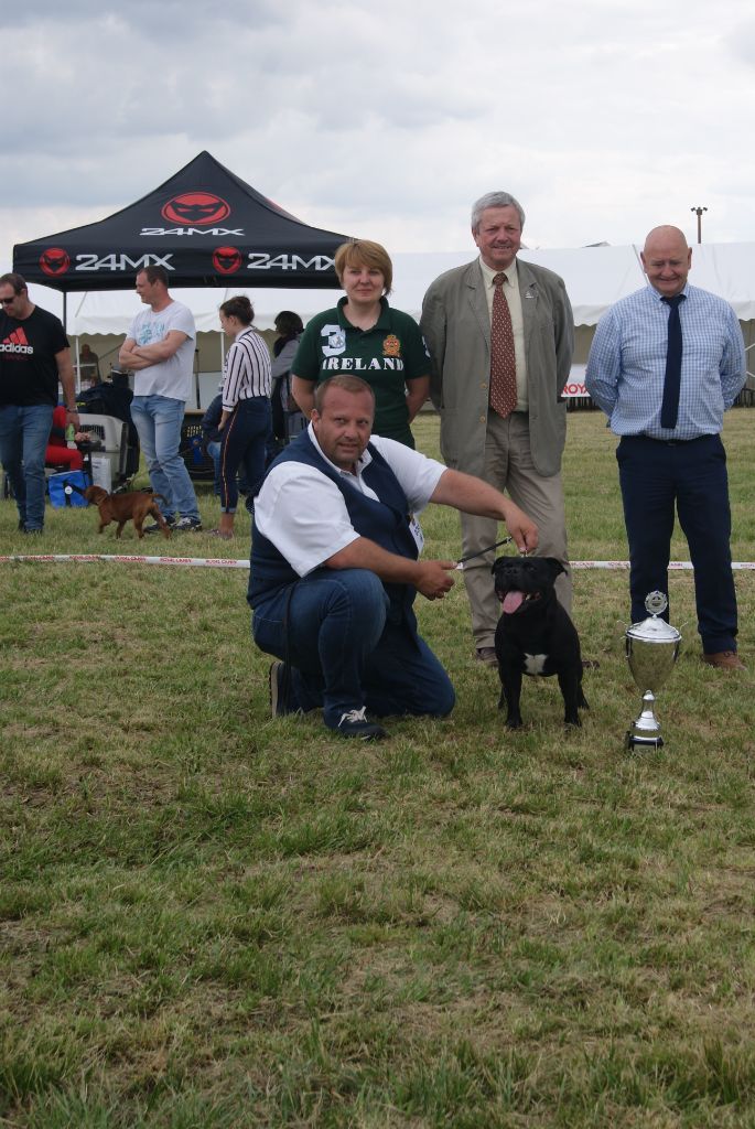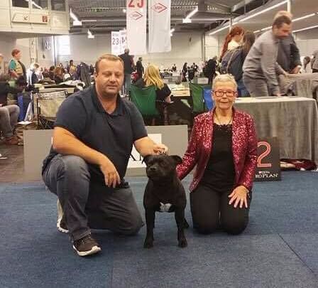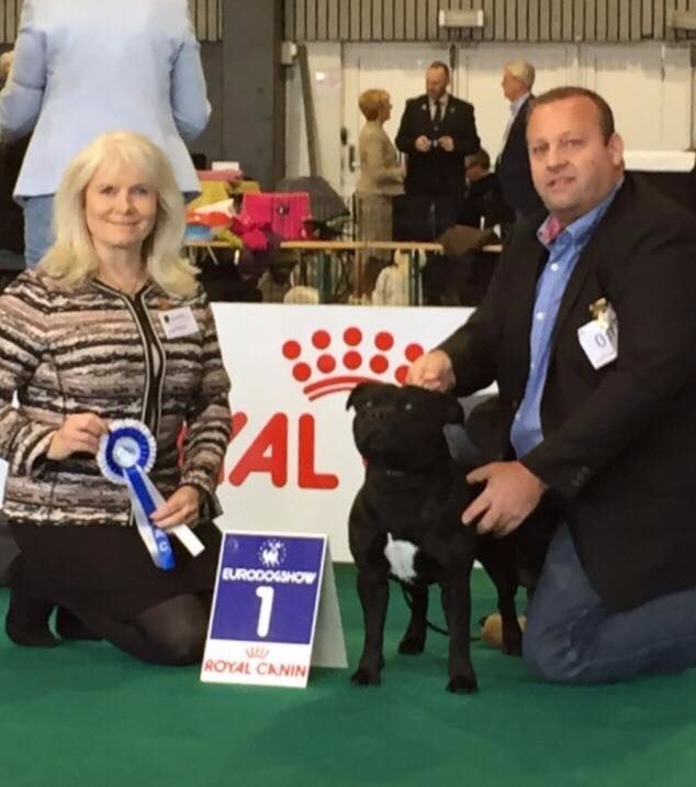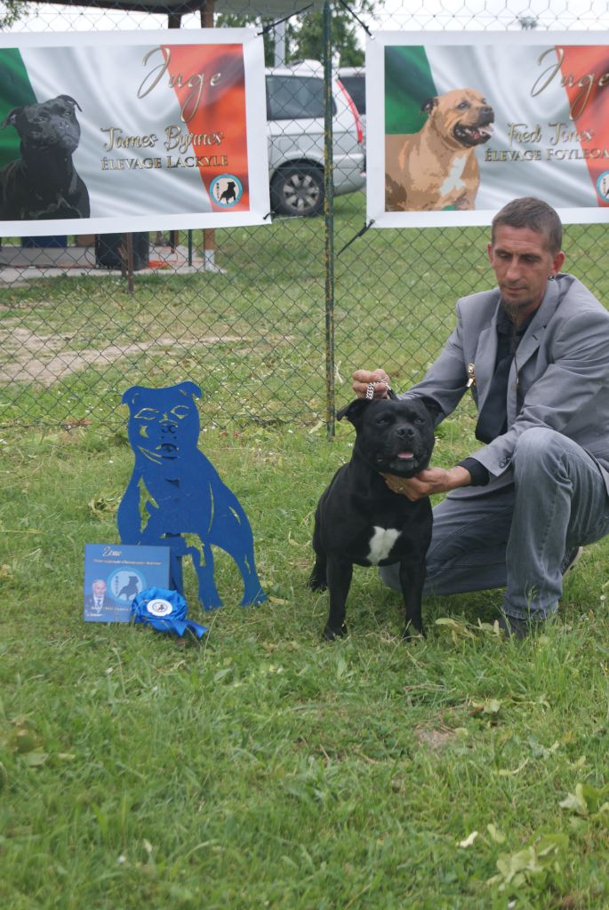 handler et propriètaire : Christophe.C ils terminent ensemble : 1ex champion meilleur mâle meilleur staffie sur 77 merci aux juges MR triqueneaux et Mr madden