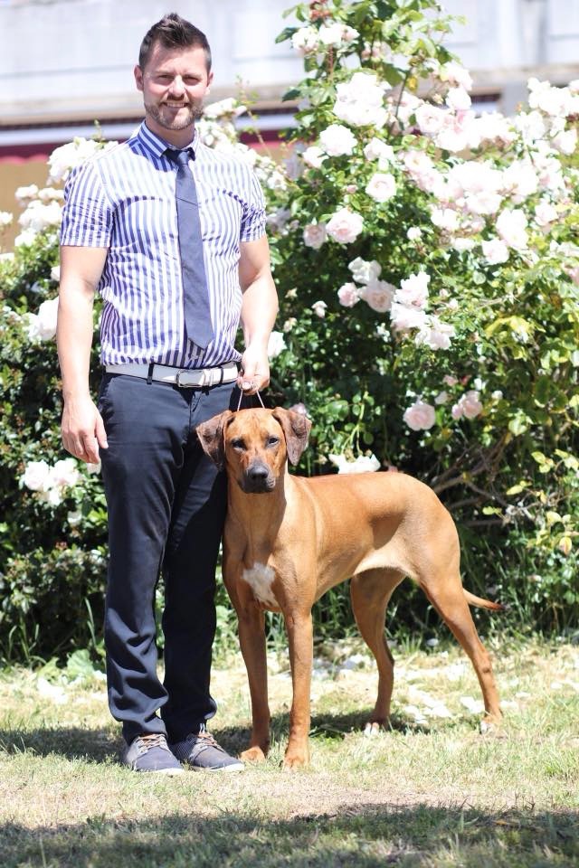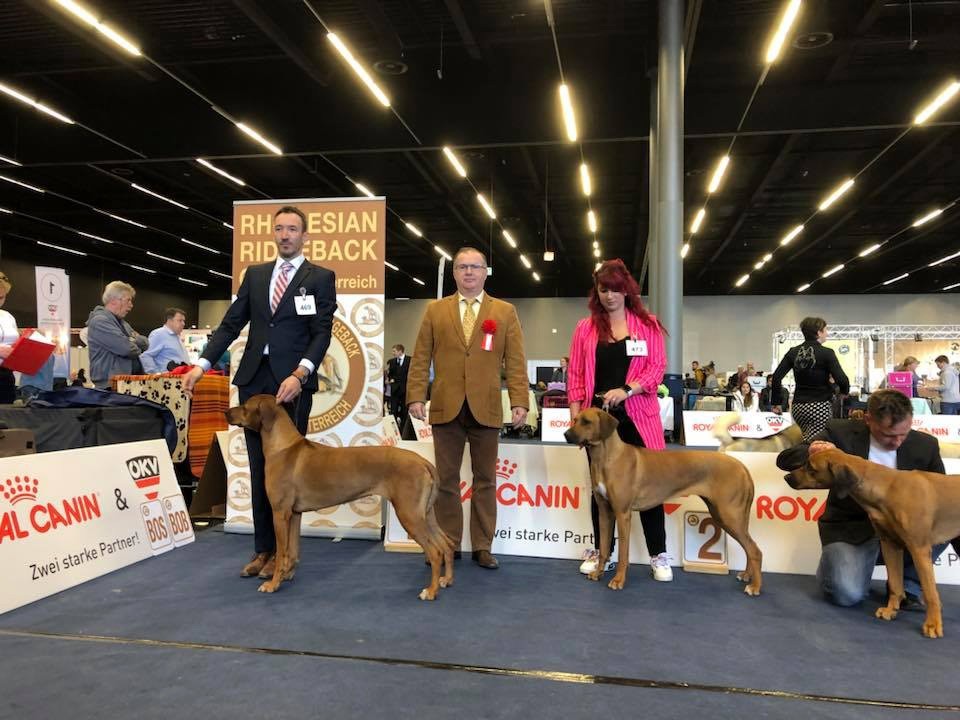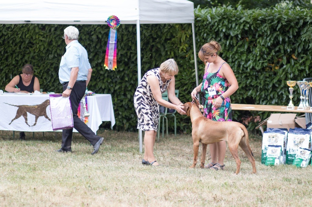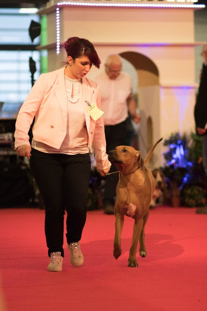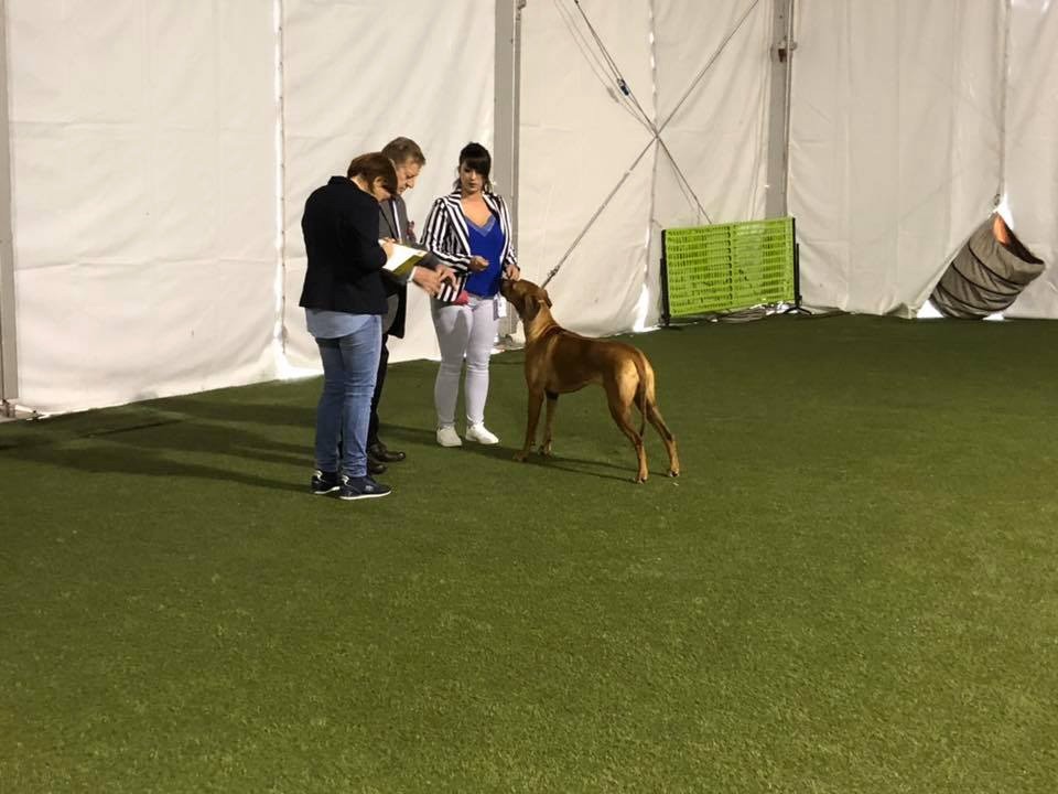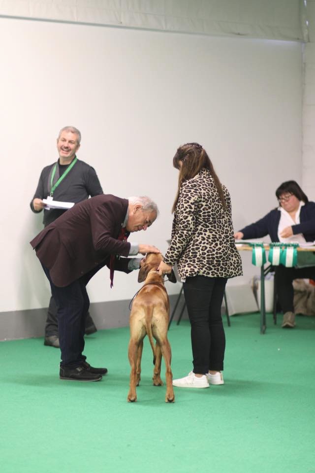 Classe Puppy: Dentition complette et correcte, chienne puissante pour son âge, présentée trop enrobée, excellent ridg, tête un peu lourde pour une femelle, encolure un peu chargée, excellent avant main et poitrine, arrière main correcte, très bon fouet, excellente couleur.