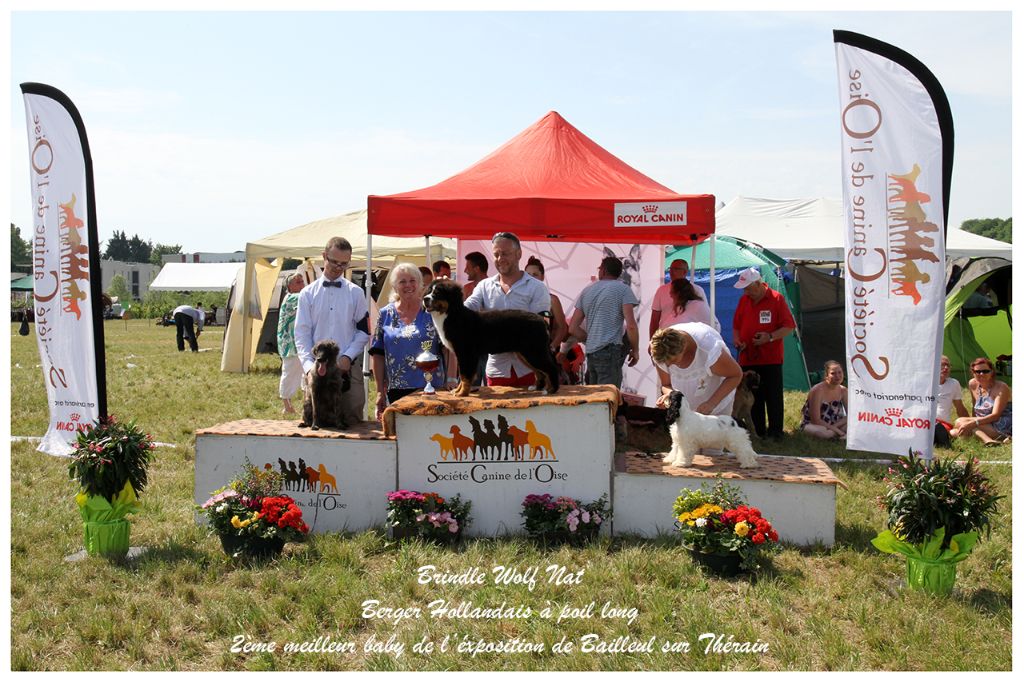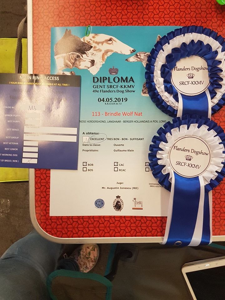 Brindle Wolf Nat âgée de 4ans et demi et Brindle Wolf Olathe. âgée de 2ans et demi. Toutes deux confirmée, dysplasie hanches (A/A) et coudes (0/0), etc... Des résultats en expositions : Championne internationale, CACS Championnat de France (pour Nat), Meilleur Jeune Championnat de France et Jeune Latine Winner (pour Olathe)