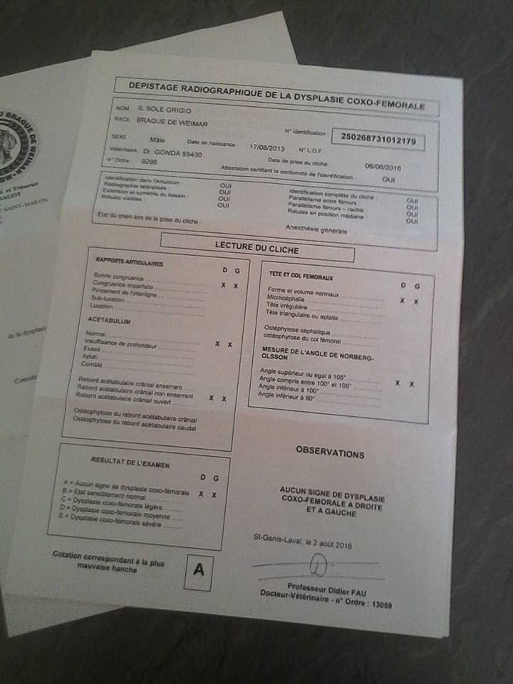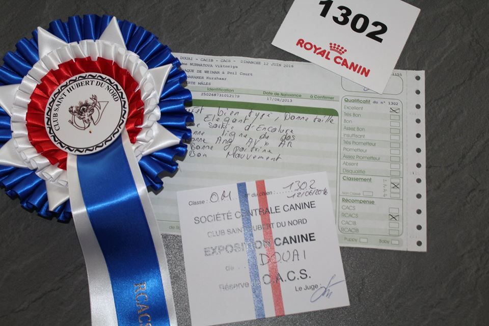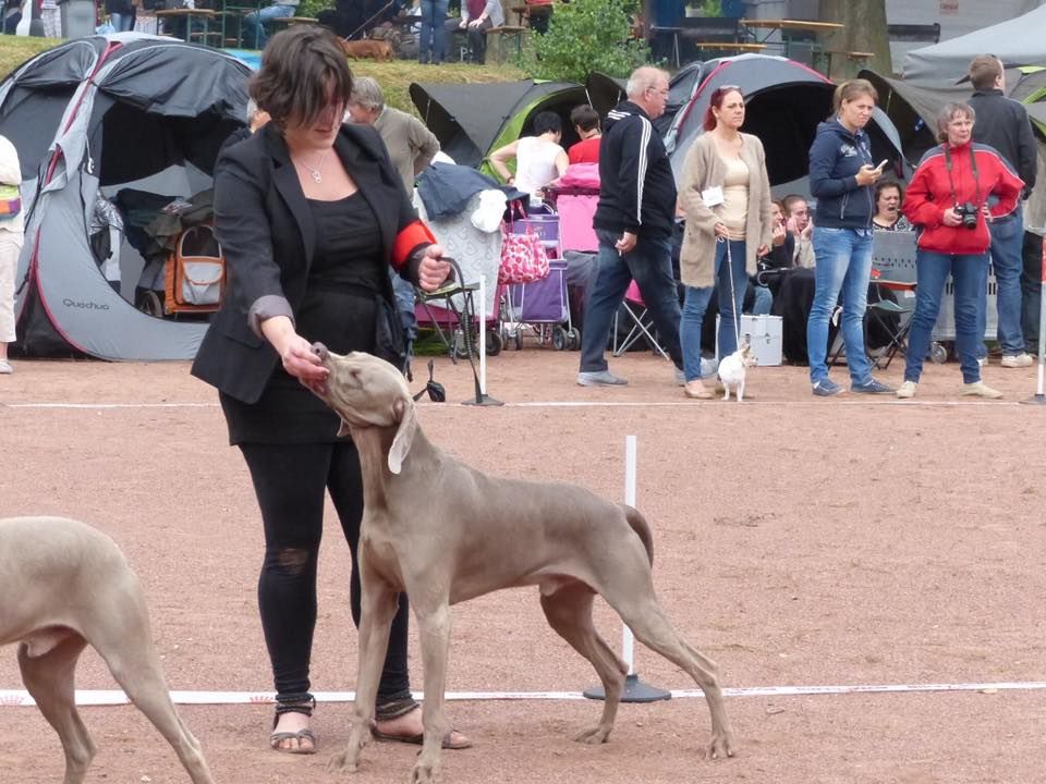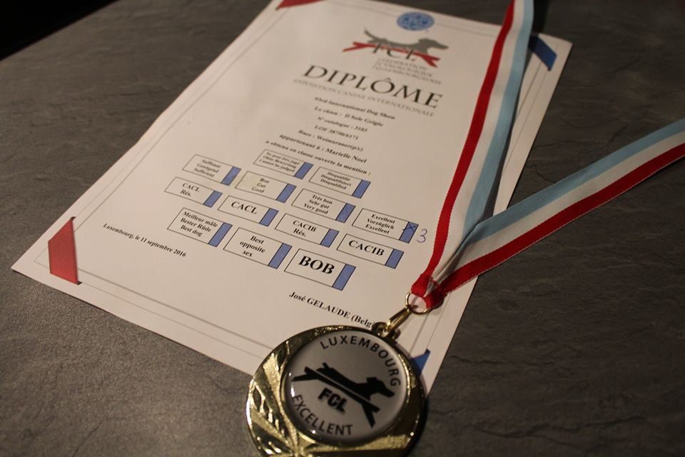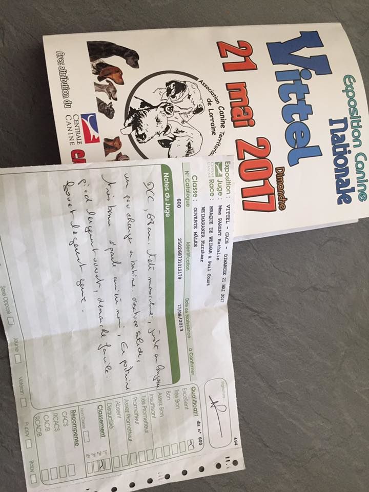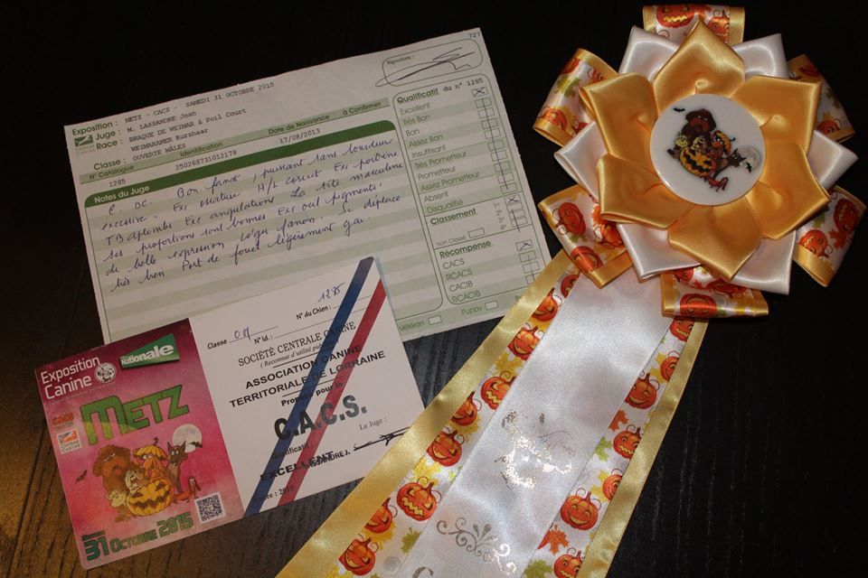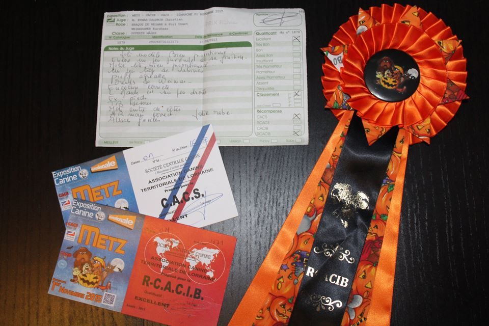 Résultats exposition internationale de Metz du dimanche 01/11/2015. 25 BDW en compétition.Il Sole Grigio 1er Excellent en classe ouverte mâle, réserve de CACIB (certificat d'aptitude aux championnats internationaux de beauté) et CACS (Certificat d'aptitude de conformité au standard). Sous le jugement de Mr Christian Eymar-Dauphin : "Joli modèle. Bien proportionné. Encore un peu juvénile dans sa finition. Jolie tête bien proportionnée. Un peu trop de babines. Profil agréable. Oreilles de Weimar. Encolure correcte. L'épaule est un peu droite. Excellents pieds. Très bon dessus. Joli cintre de côtes. Arrière main correcte. Jolie robe. Allures faciles."