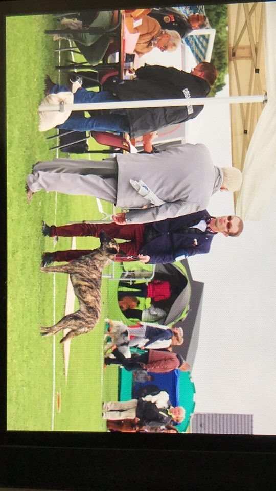 Tête: DC, TB tête longue, ex oeil TB pigmenté, oreille portée un peu écartées, TB //. Corps: TB proportion, dos assez tendu, TB croupe, Ex poitrine de bébé, TB aplombs, TB angulés, TB mouvement, réaction et allures de bébé