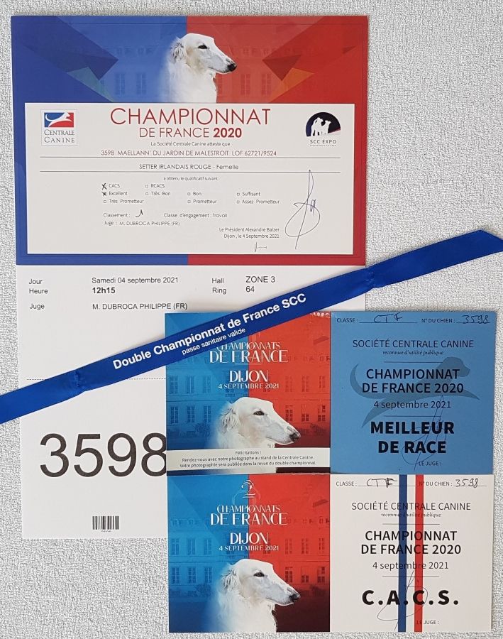 "Chienne la plus complète, d'où son résultat"."Une épreuve à CACS se juge selon les directives du club de race. C'est ce que j"ai fait en décernant le meilleur de race à la très jolie MAELLANN' DU JARDIN DE MALESTROIT à Florence Carton. Cette lice, bien construite, a beaucoup d'élégance en mouvement et même quand le juge fait durer les tours de ring".