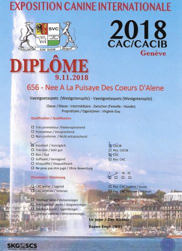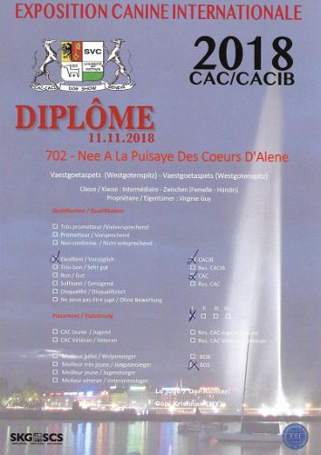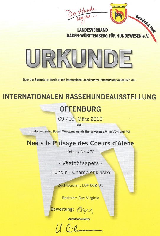 en classe jeune au Luxembourg, elle remporte le Meilleur de race et à la Mondiale d'Amsterdam, elle se classe 4ème excellent avec un juge finlandais !