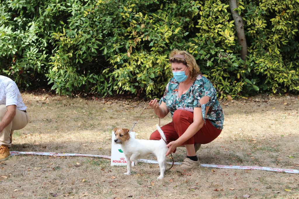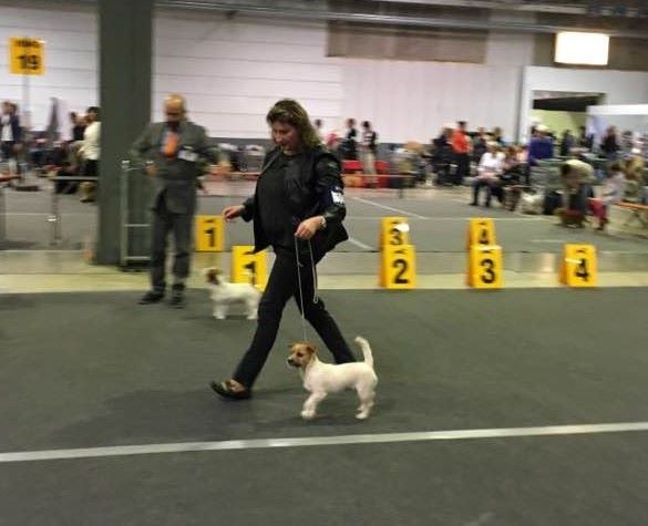 Silhouette bien féminineTete très bien proportionnéeExc oeil forme couleurArticulation en ciseaux, manque un croc supérieur ( justificatif veto ) Exc poitrail poitrine dessus dessous Mouvement pas toujours bien alligné a l arrière , herbe un peu haute sur le ring