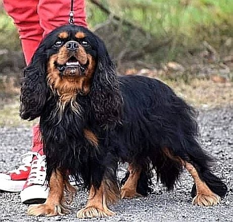 Exc forme de tête, attache d'oreilles correcte, exc stop et hauteur de front, exc yeux, exc chanfrein, exc articulé, exc devant avec poitrine, pieds, exc postérieurs, dos solide, exc attache de fouet, arrière main bien angulée, fourrure correcte, exc mouvement, allure régulière, exc présentation.