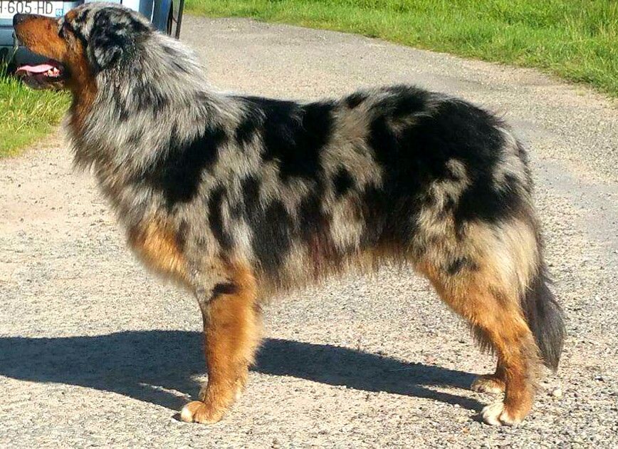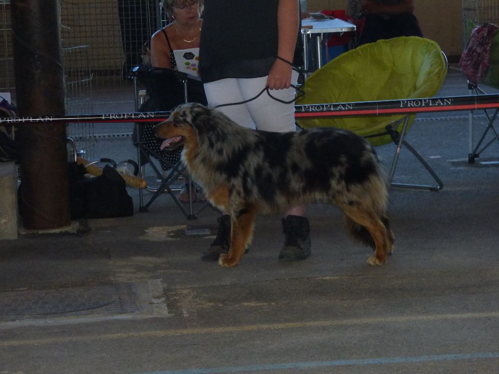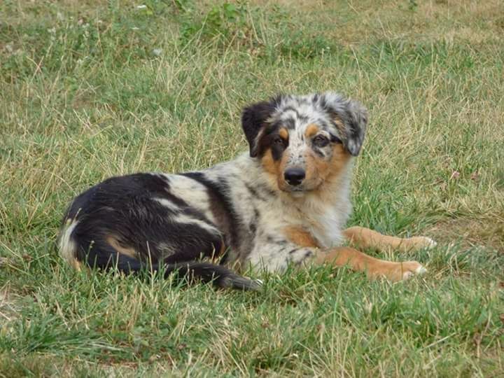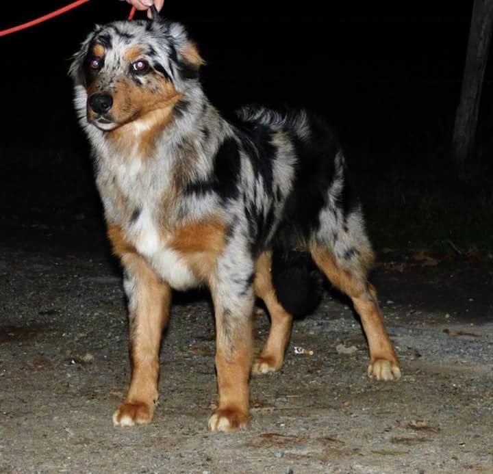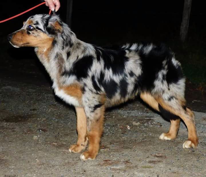 DCC EXC phénotype robe merle ensemble encore un peu juvénile tête masculine mais qui devrait prendre un peu + de largeur T.B. dessous poitrine correcte aplombs // EXC angulation allure un peu rasante doit se détendre et comprendre pourquoi il est là