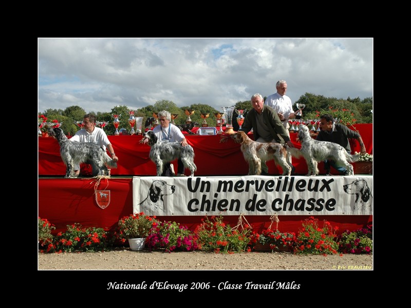 CLASSE TRAVAILbien setter dans son ensemble,ex ligne de dos,ex sortie d'encolure,ex rayon avant -arrière,ex poitrine,tête bien setter,ex soies et pigmentation, ex présentation,démarche fougueuse et active, démarche puissante.