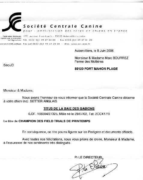 premier titre de champion de printemps pour "de la baie des gabions"avec un setter anglaistotal du nombre de chiots produits en 15 ans = 35 chiots.