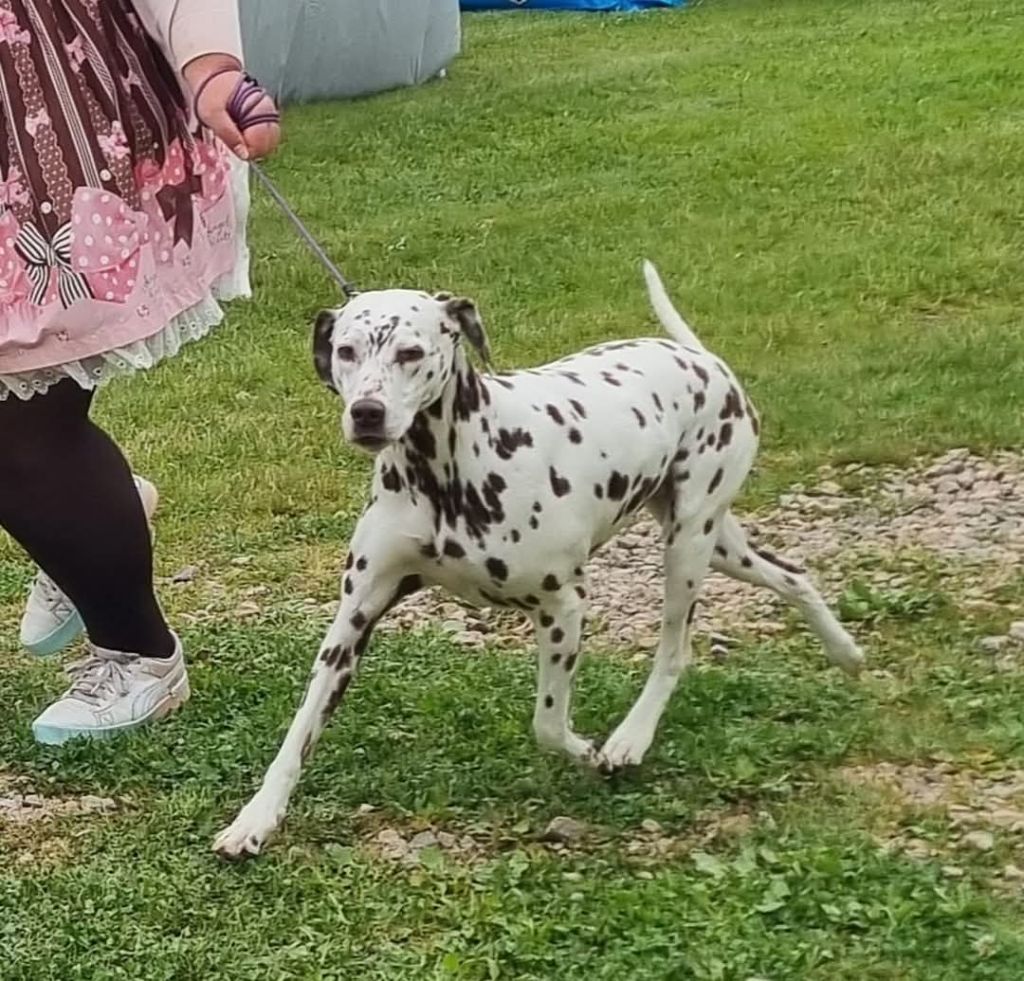 Elle représente tout à fait mon idéal du dalmatien, une magnifique femelle, bien dans ses pattes et sa tête, avec un caractère extra que ce soit avec l'Homme ou le chien ou tout autres animaux.