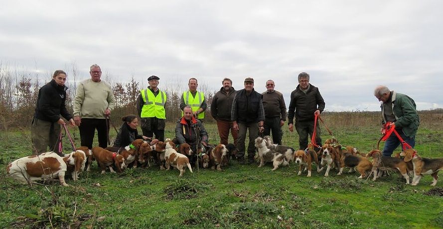 Lot n°12 - 4 Bassets Hound d'un bon modèle, en état de chasse appartenant à la meute des Côtes de la Saunade et Mme C*****Par temps couvert. Les chiens quêteront un long moment, puis en deuxième partie de parcours un lapin démarre, ORANGETTE prend la voie, se récrie puis tombe en défaut qu'elle ne relèvera pas. Les autres chiens ne participent pas à l'action. *(1 chien de ce lot ne nous appartient pas)