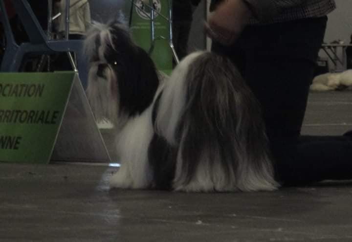 Exc sujet, proportion tête, crâne, profil ,oreille, pigmentation épaule ,avm, encolure, ligne de dos ,poitrine postérieur att de fouet TB yeux et dent Exc qualite de fourrure et présentation exc démarche