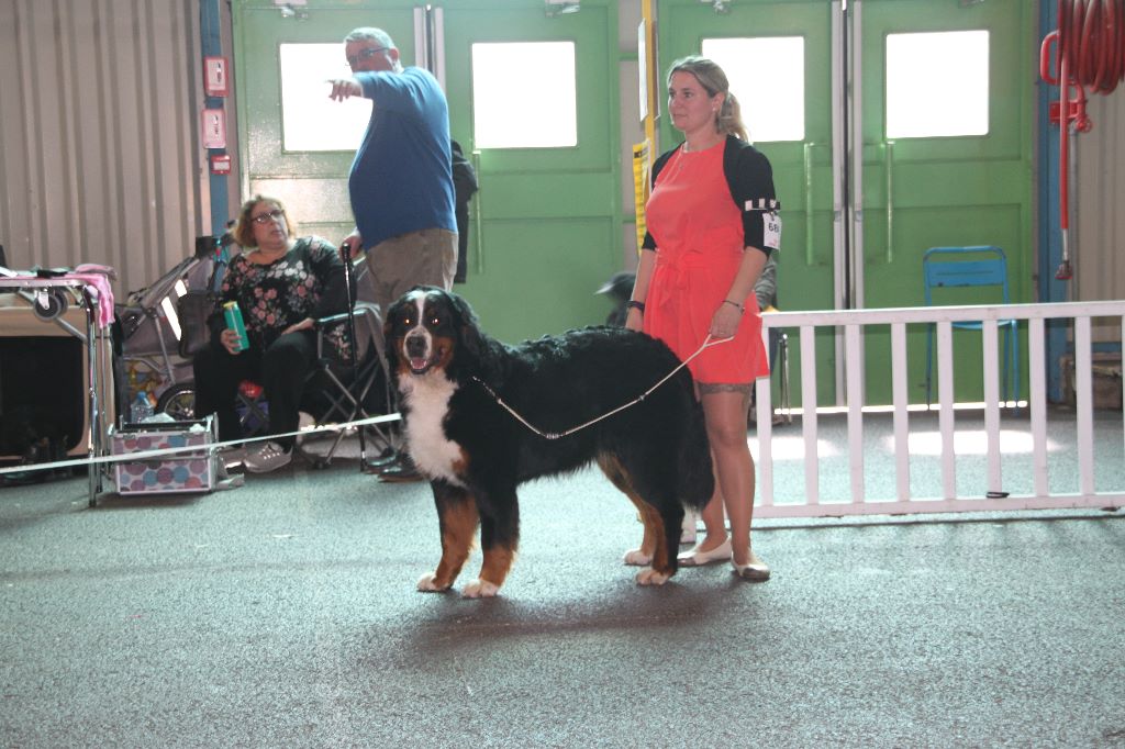 Femelle puissante, bonne proportion en tête ?il de bonne forme et couleur . DCCDessus solide Excellente cote et poitrine. Ossature puissante Excellente angulations avant et arrière Excellente amplitude et poussée