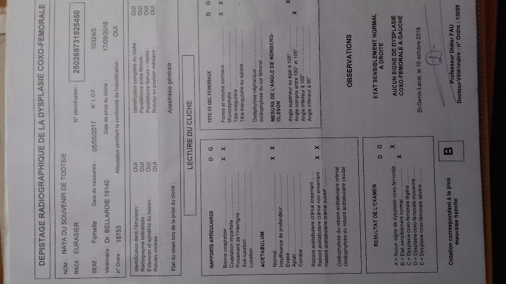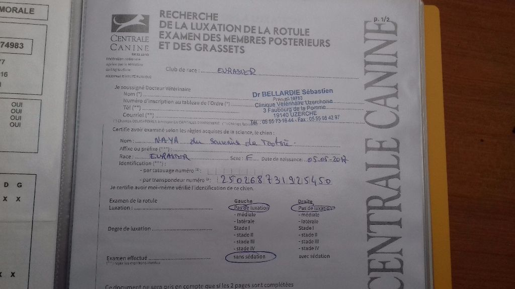 Luxation des rotules - indemneDysplasie de la Hanche - A/BDandy Walker - Indemne par filiation Dentition - DCC
