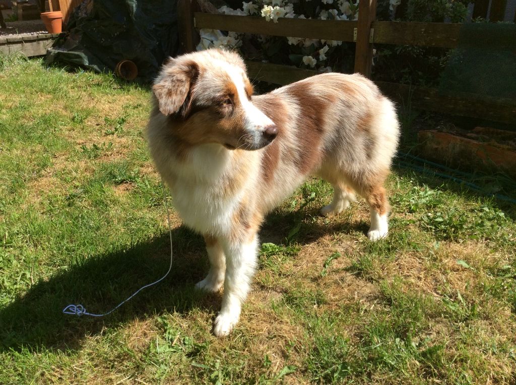 Rouge Merle - DCC - Chienne puissante - Construction correcte - ligne de dessus un peu souple - Belle sortie d'encolure - Jolie tête - Oreilles un peu lourdes - Excellent rapport crâne/ chanfrein - le stop est correct pour l'âge - TB oeil - Excellente ossoclature - Aplombs AV à surveiller - Excellente poitrine pour l'âge - Bonne AR main et croupe - Se déplace bien