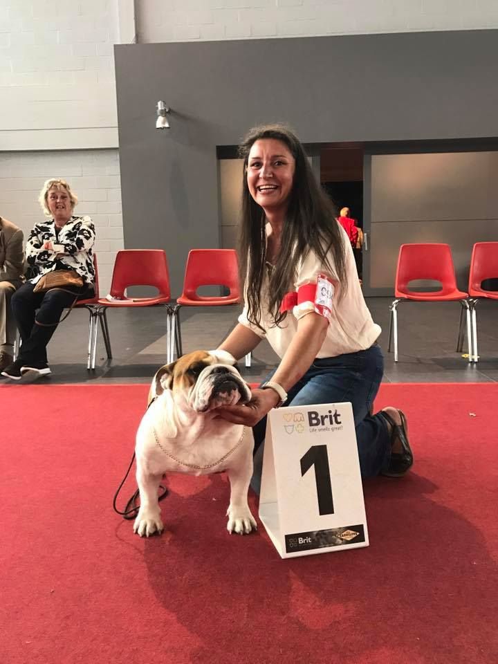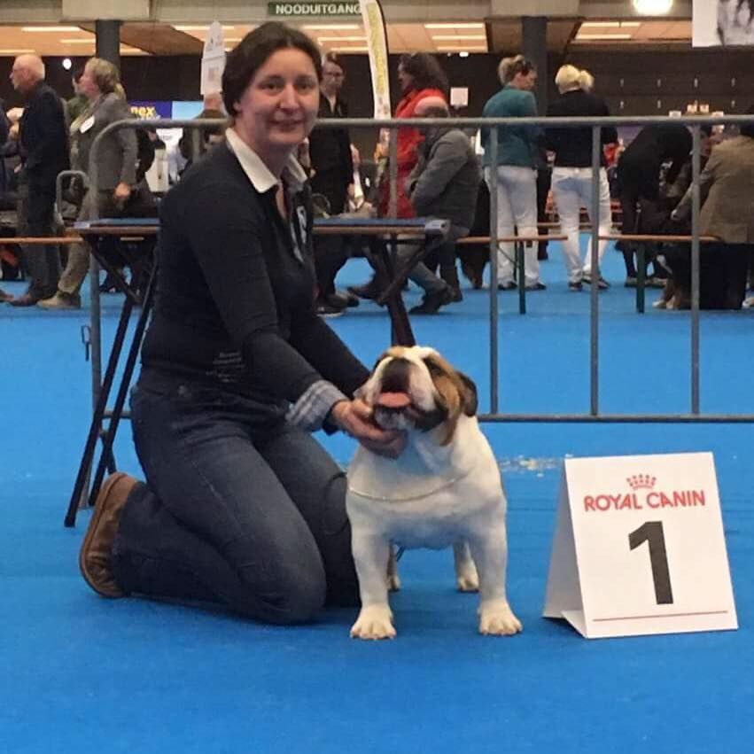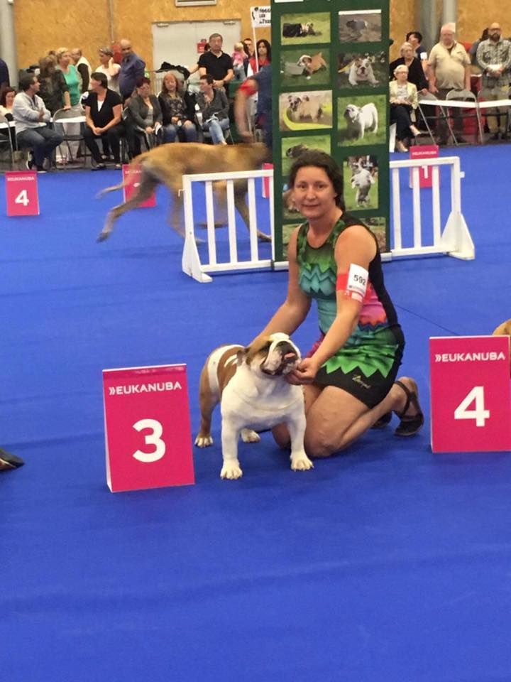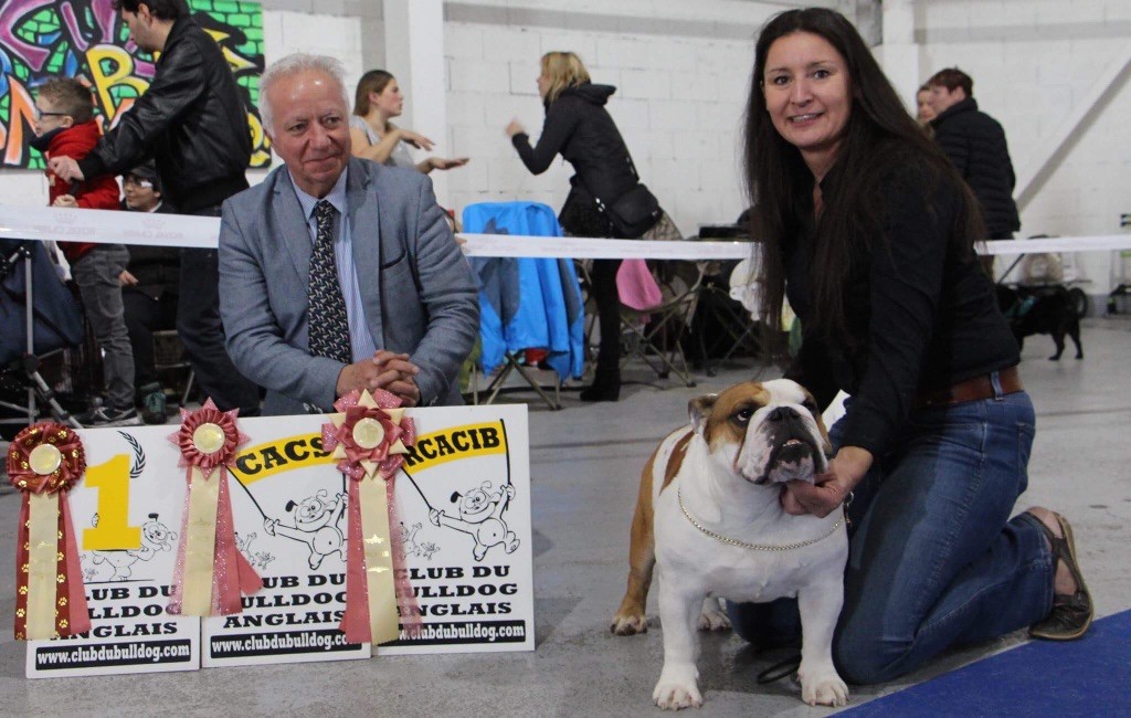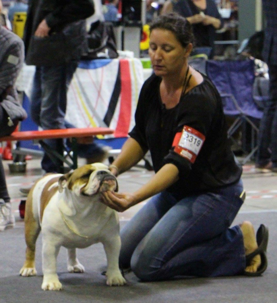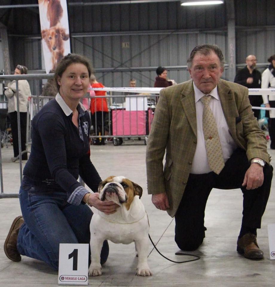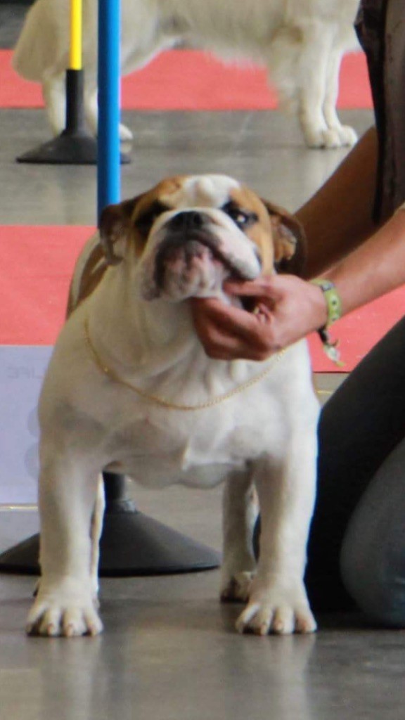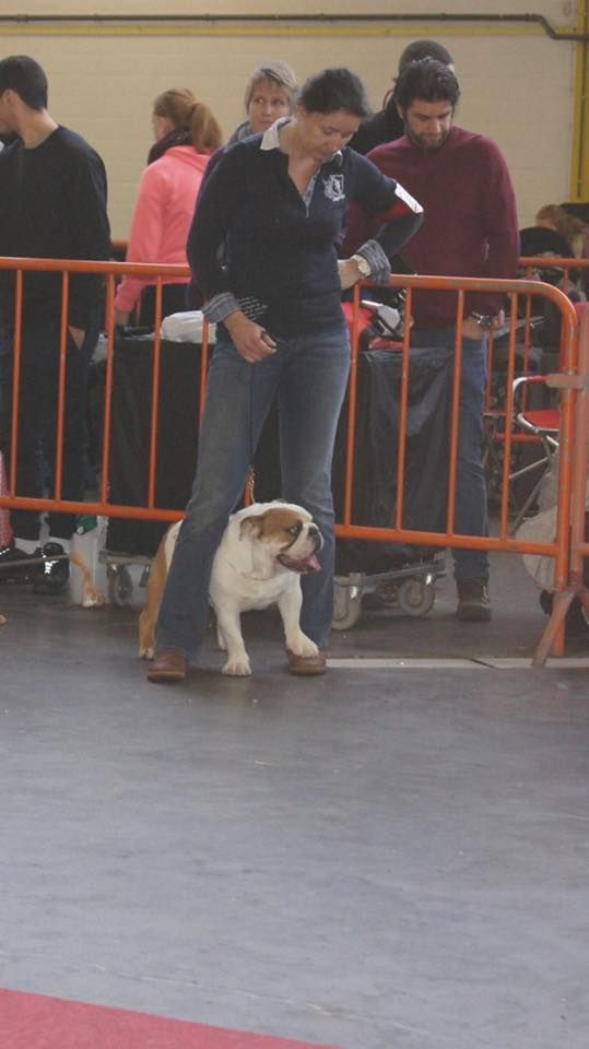 en excellente condition. Bonne ossature. Tête avec une bonne expression typique. Bon museau court et large. Bonne largeur de mandibules bonne courbure de la mandibule. bons yeux bien foncés et sain bonne oreilles en rose bien placées bonne ligne de dessus poitrine profonde et bien descendue bon aplombs av bonnes épaules bien rapportées bon arrière main queue bien placée mobile bonnes allures typique